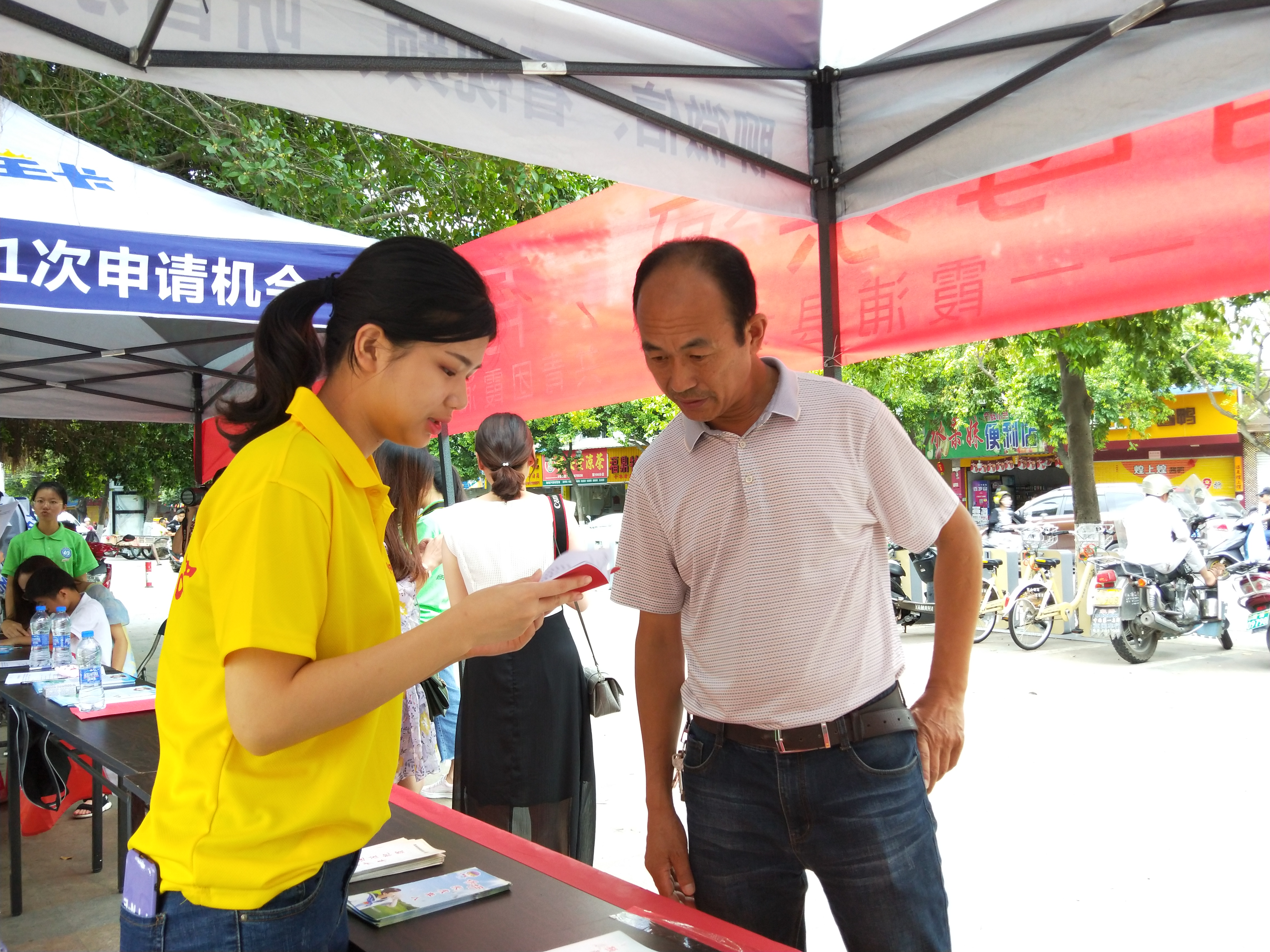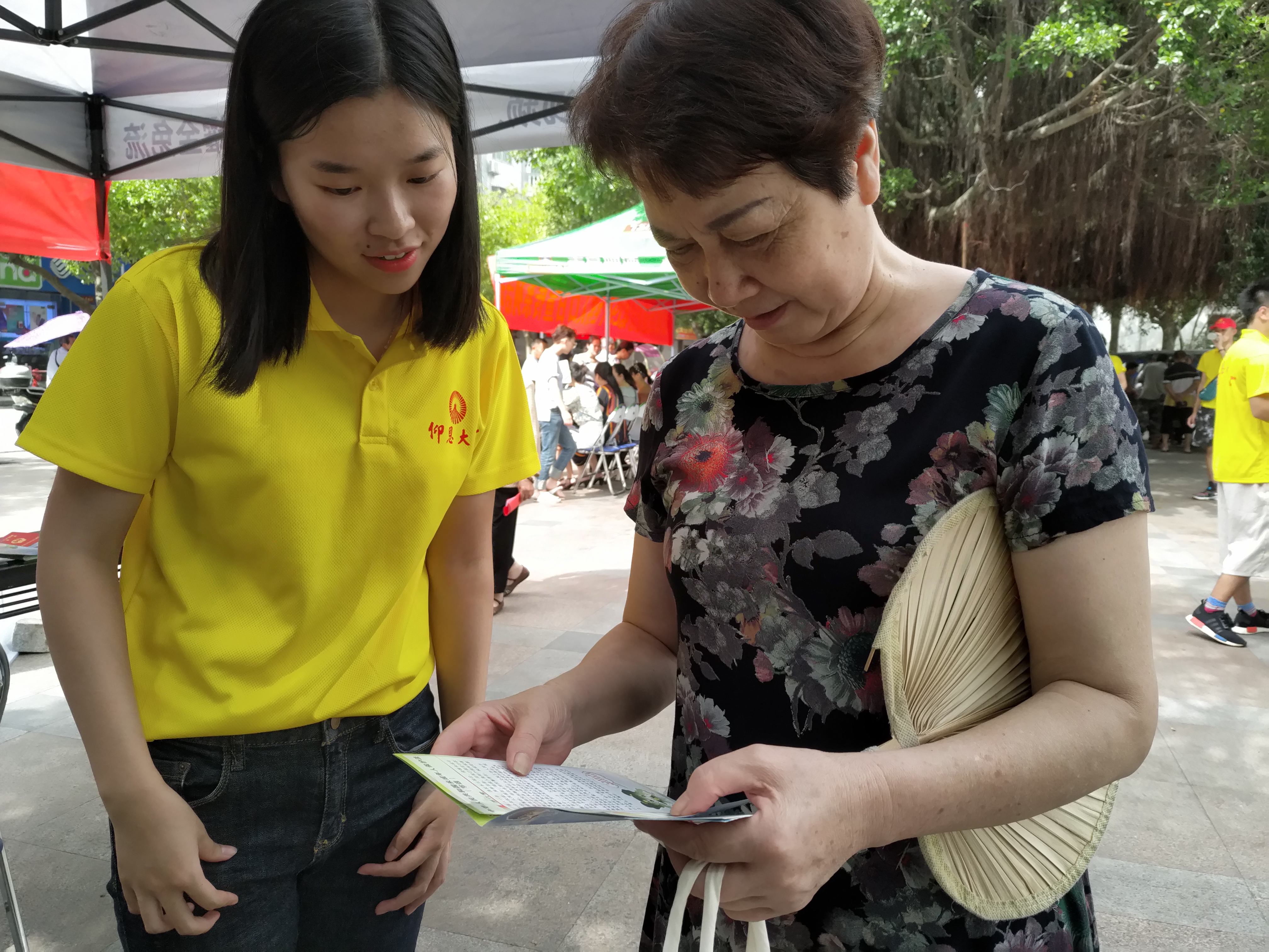 在文化广场上设立服务站,分发宣传册和禁毒宣传的纪念品。实践队伍分为两个部分,8名实践队员到街上分发宣传册,另外8名队员在站点进行讲解禁毒内容和分发纪念品。在领取禁毒纪念品前,需要领取人扫码关注共青团霞浦县委员会,了解更多禁毒知识,让霞浦人民参与到禁毒工作。与此同时,共青团县委也安排了宁德师范学院绿色环保何小禹暑期实践队在此地宣传保护水资源。在此期间,两支队伍进行了禁毒知识与保护水资源的内容交流以及分享实践的经验,并互相鼓励,合影留恋。