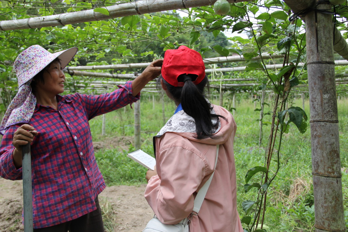(图为实践队员听农户介绍百香果生长情况)