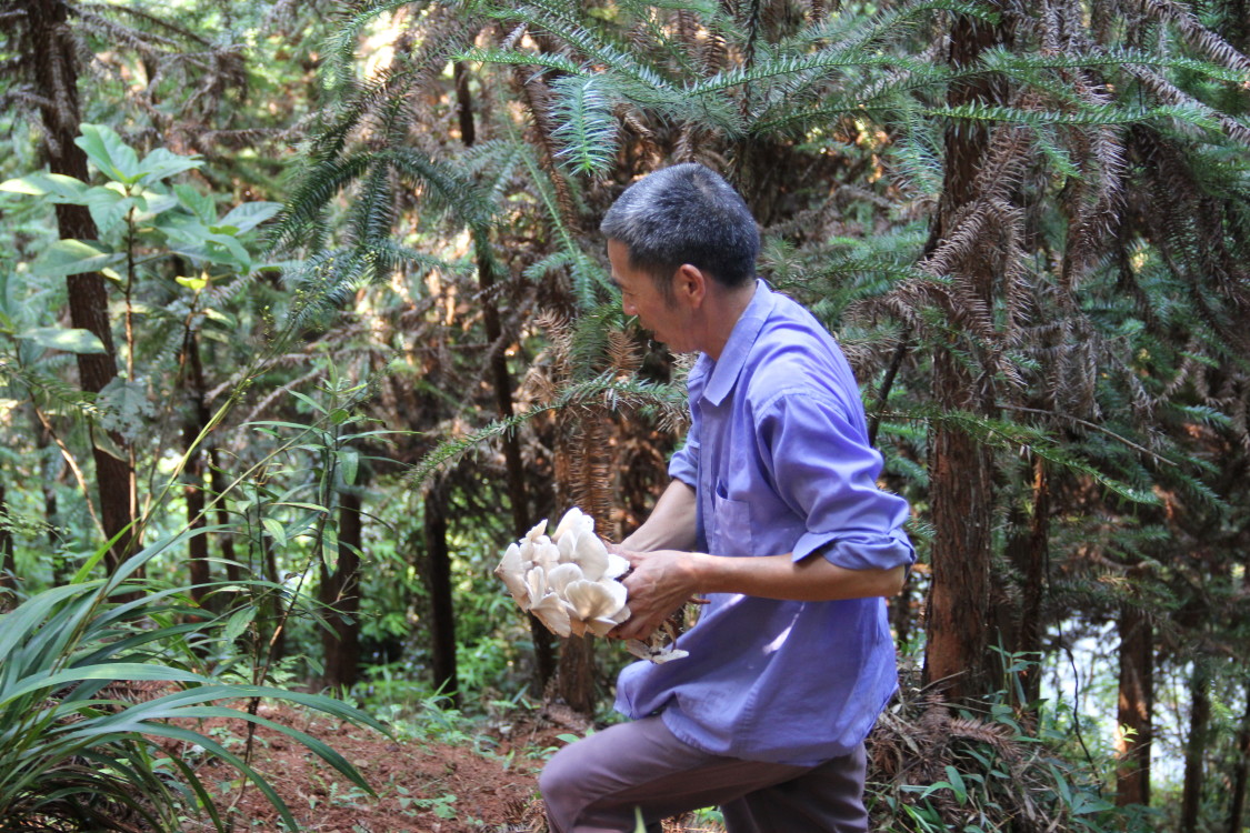 (图为农场主张寿福采摘菌类)