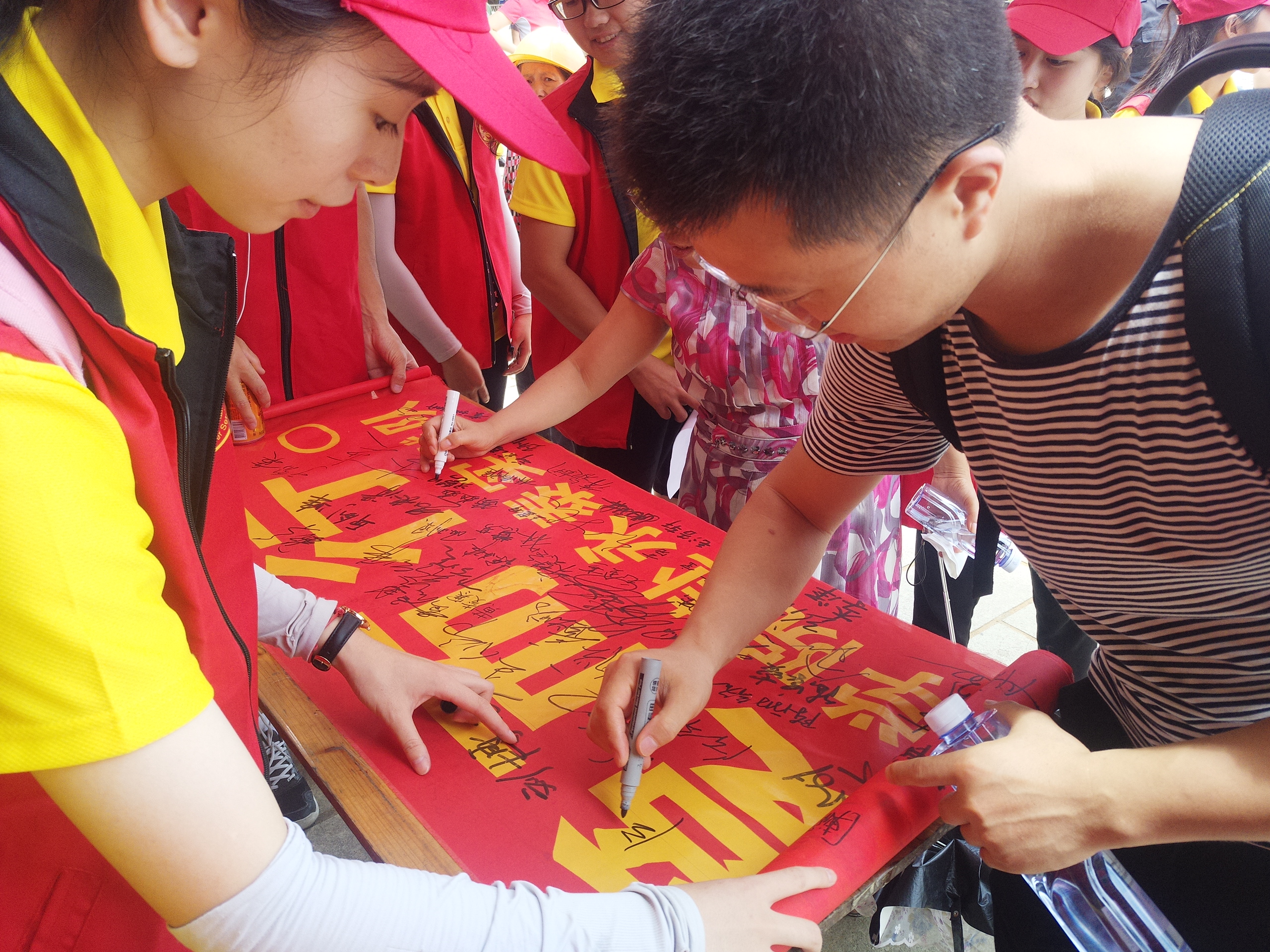 图为游客在横幅上签名