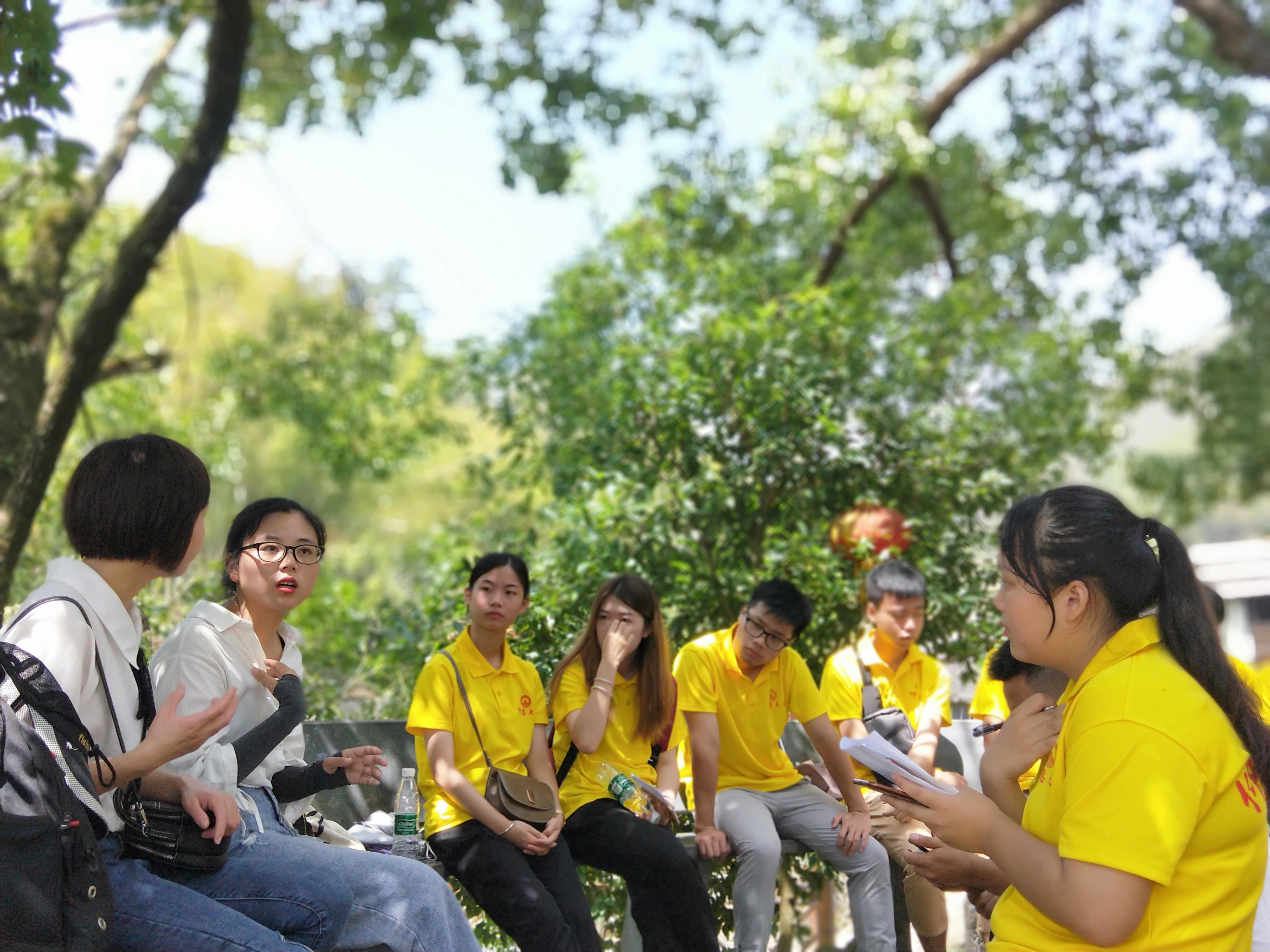 (图为指导老师赖桂全和和实践队队员与陈华妹进行交流)