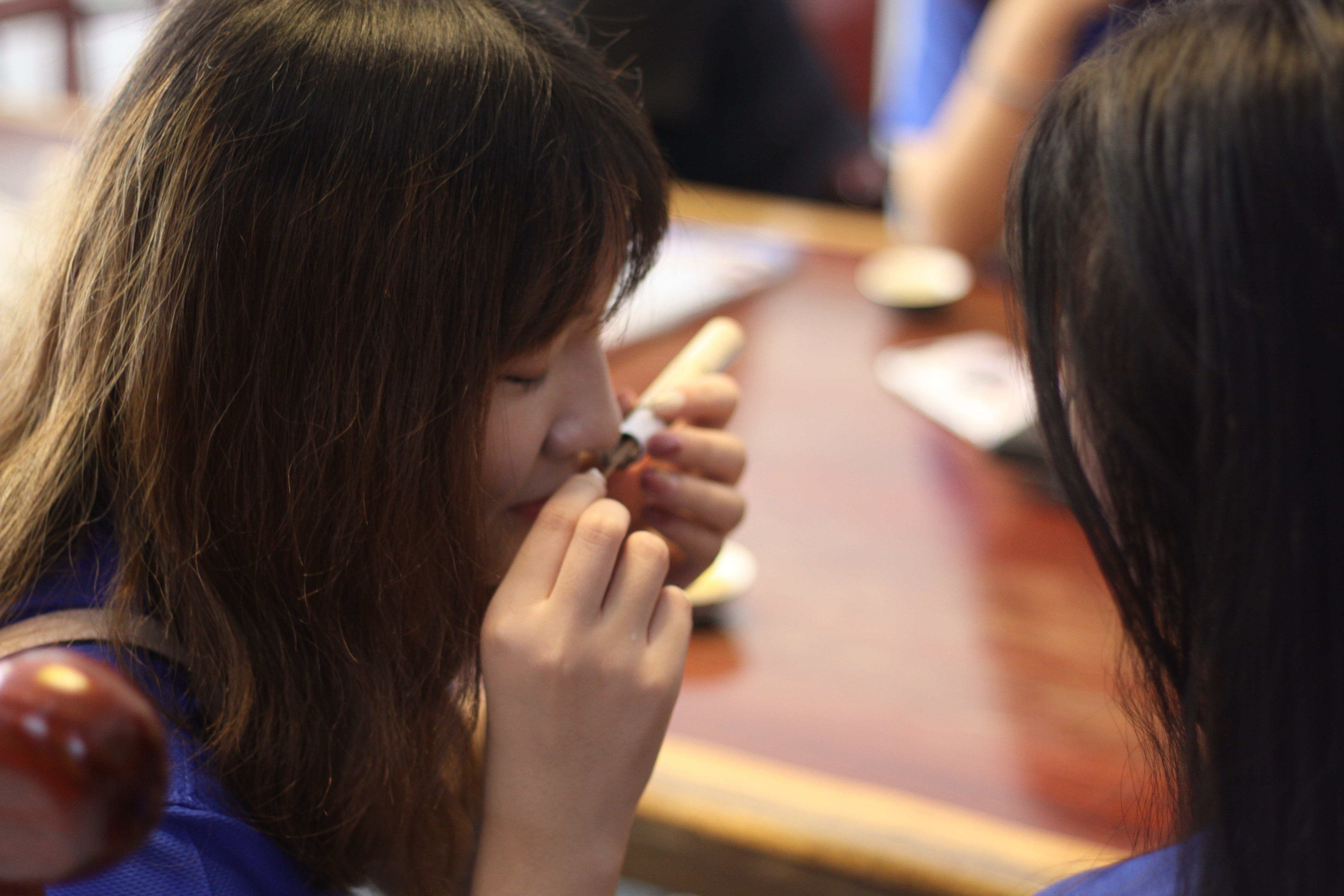图为实践队员在品蒲良宫老师制作的篾香