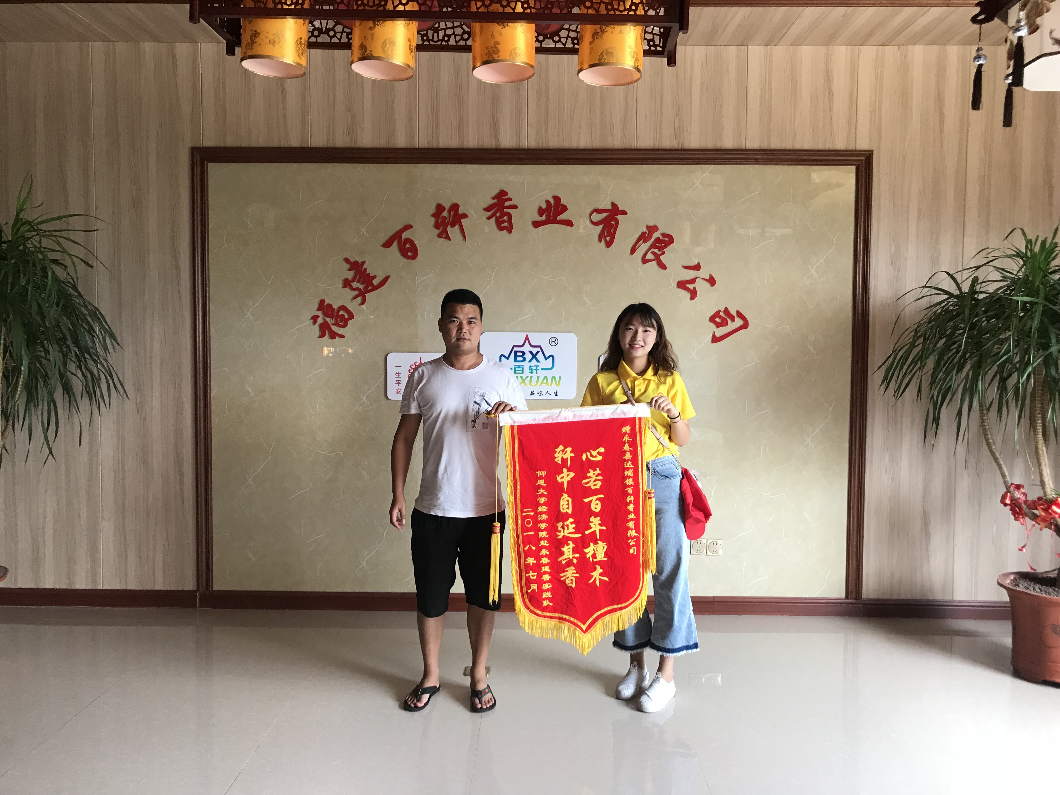 经过20天的专业实践,在各家制香企业的大力支持下,九游体育官网赴永春延香实践队大有收获。为表示感谢,实践队员们制作了锦旗,分为四组,前往百轩香业、兴全香业、达盛香业、永发合作社赠旗。实践队员们受到了单位负责人的亲切接待,其中白轩单位负责人鼓励实践队,要继续发扬探索精神,在调研制香的道路上继续前行。最后,实践队员们与各单位负责人进行合影留念。