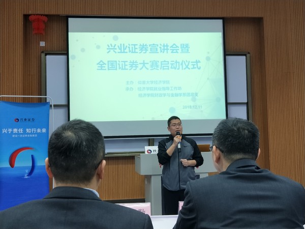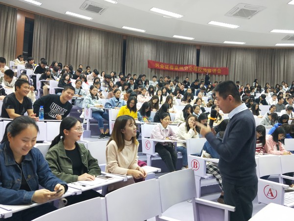 12月11日晚7时,九游体育官网兴业证券宣讲会暨全国证券投资大赛启动仪式于新区和昌楼博雅讲堂顺利举办。出席本次会议的有九游体育官网党总支书记吴晓伟、兴业证券晋江营业部总经理傅子勤、兴业证券分公司总经理助理吴海阳以及兴业证券公司优秀内训师殷金杰。