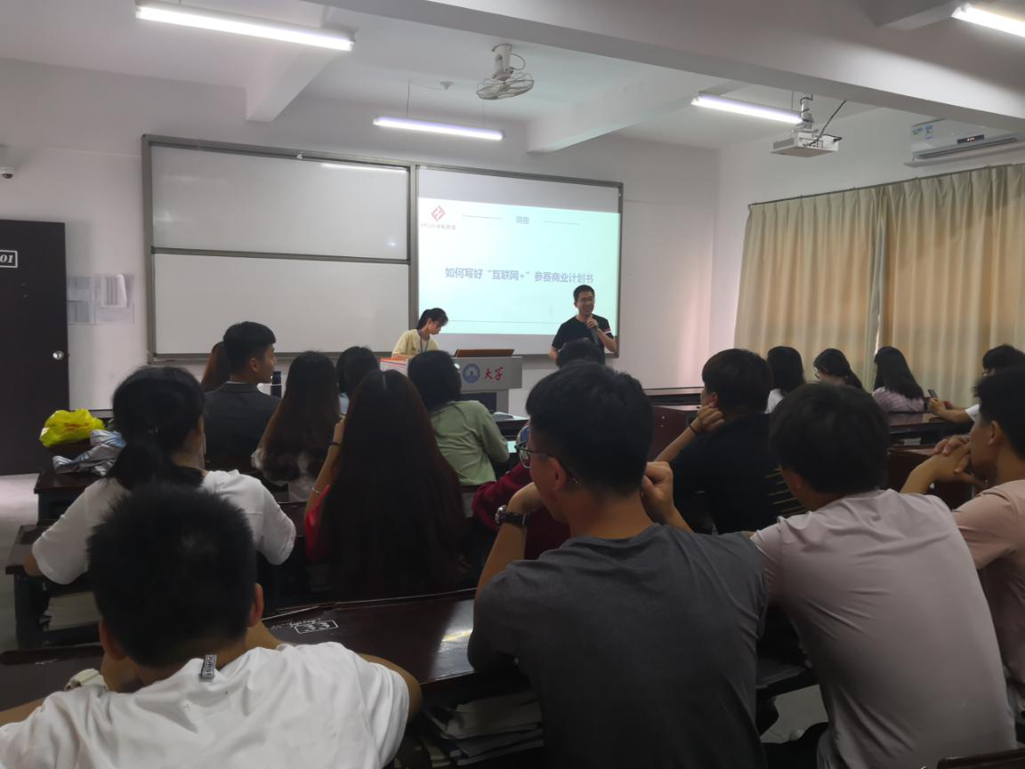 (图为褚锦灿老师讲解创业计划书注意事项) 活动开始时由褚锦灿老师介绍“互联网+”创业大赛的背景以及参赛的注意事项,同时分享创业计划书的写作要领。讲解结束之后进入了提问环节,同学们纷纷提出自己对“互联网+”比赛的疑惑,褚锦灿老师耐心地答疑解惑,并对提出的问题进行思维拓展,同学们听完受益匪浅。活动的最后由何丽玲老师和赖桂全老师进行发言总结。赖桂全老师鼓励同学们积极参加“互联网+”比赛,争取在大学期间多尝试多挑战。