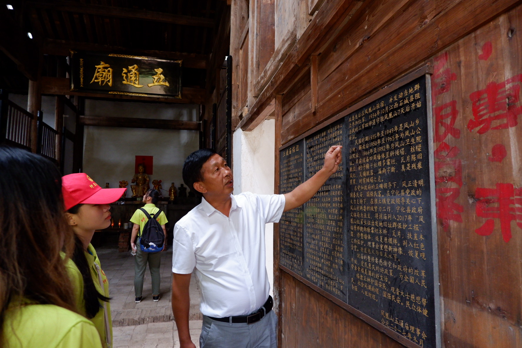 (队员们听书记介绍红军与五通庙的故事)