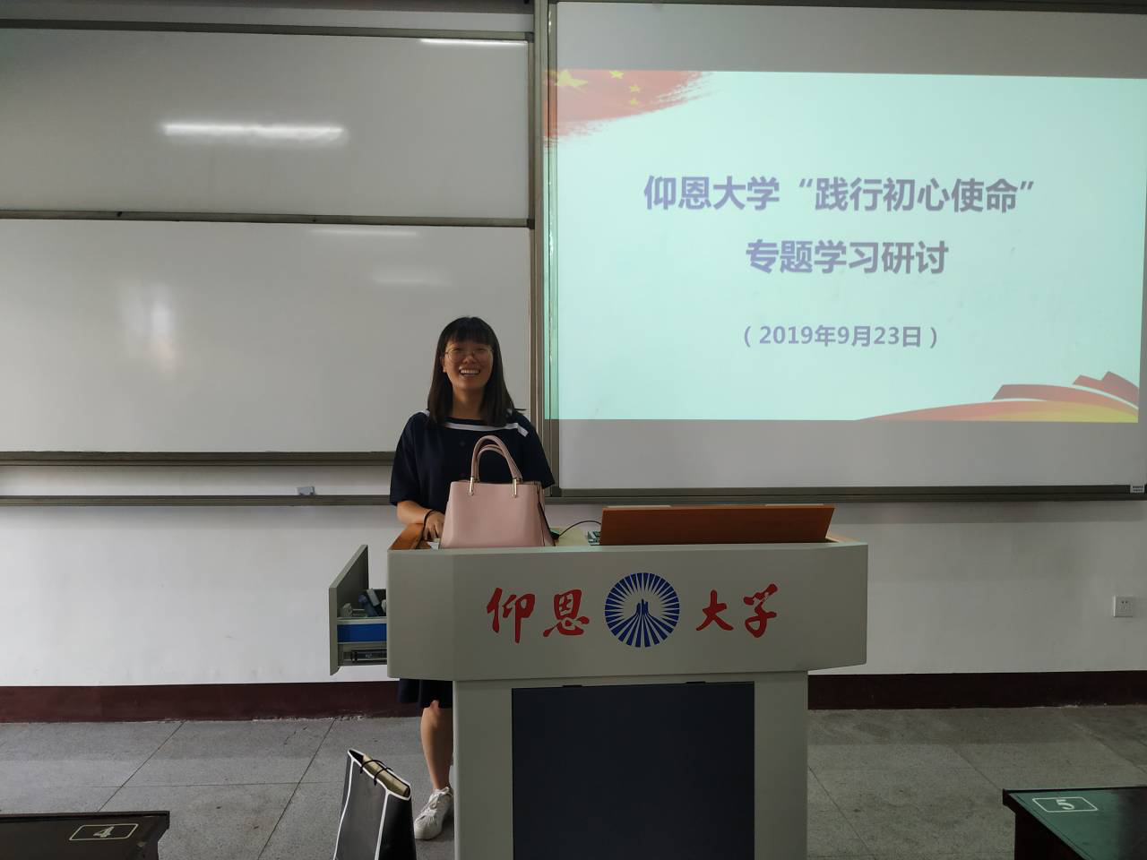 9月23日到24日, 金融系学生第二党支部于在仰恩楼A4-105教室开展了“践行初心使命”专题学习研讨会,党支部全体党员参与了本次学习会。本次会议以PPT的形式学习理论知识,与会党员上台分享学习心得。