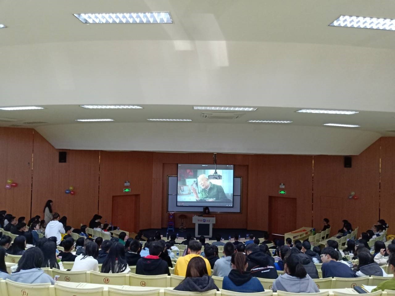 (图为全体观众共同观看爱国短片) 随后,道德人物惠安爱心社社长戴鸿铭先生以“以小爱筑大爱,做一名爱国的公益人”为主题开讲,戴鸿铭向观众们讲述了“何为爱心社、如何精准献爱心,把爱心献给最需要的人”等内容,在爱心社帮扶的一个个实例中,在场观众深刻感受到了无数的小爱能够汇聚成影响深远的大爱,在帮扶弱势群体的路上,每个人能做的都很多。戴鸿铭在活动最后说:“作为一个最平凡的公民,我们能够在公益的路上做实做好,就是我们公益人爱国的形式。”