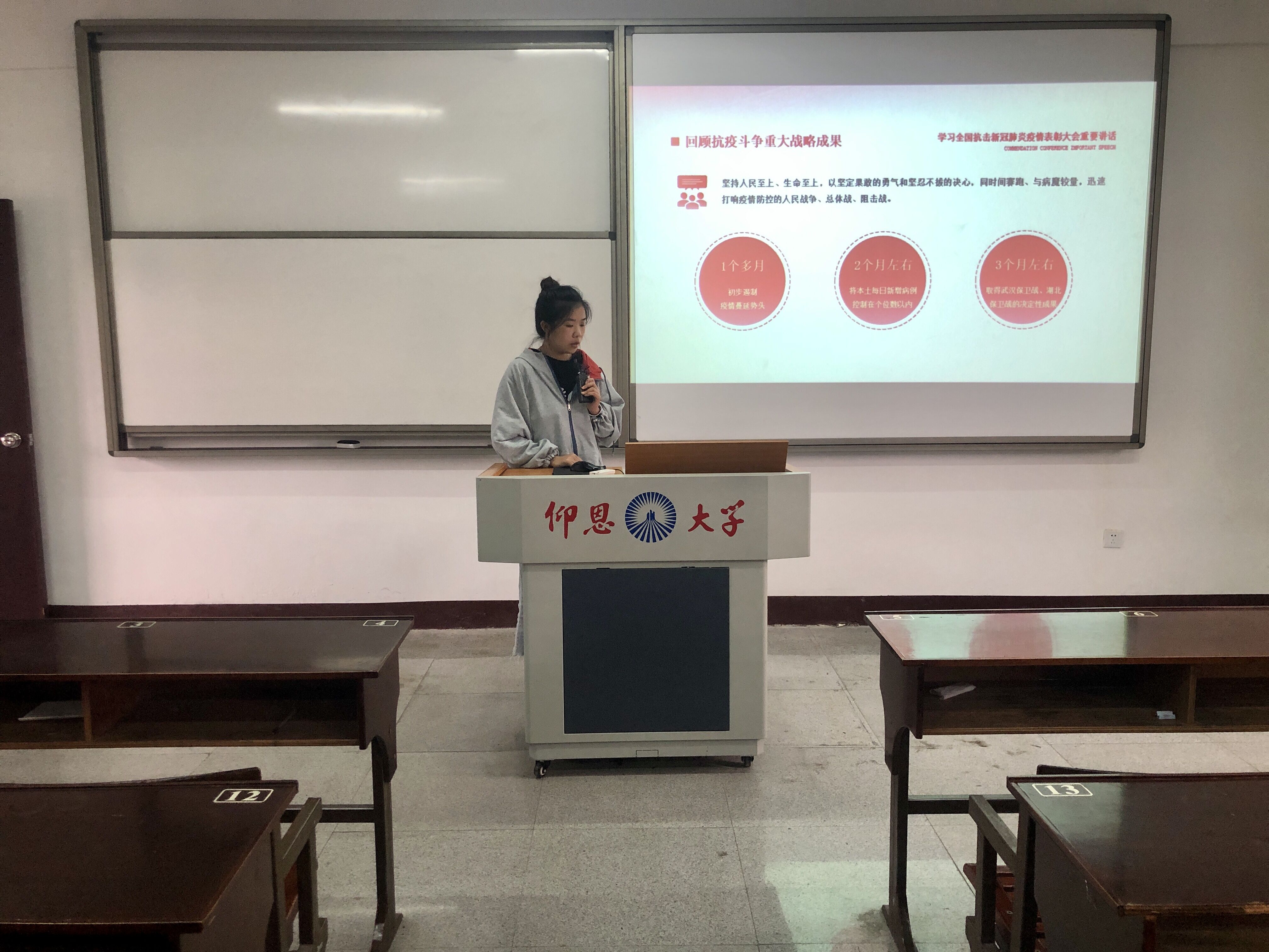 大会开始,首先由主持人介绍了本次分享会的流程,带领19级与18级的积极分子代表依次上台发表学习表彰会后的心得感悟。使同学们理解了习近平总书记指出的要扎实做好“六稳”工作、全面落实“六保”任务,加快补齐治理体系短板弱项等五方面任务的要求。最后,同学们纷纷表示要把生命至上、人民至上的理念融入工作之中,进一步弘扬抗疫精神,展现中华民族的希望。
