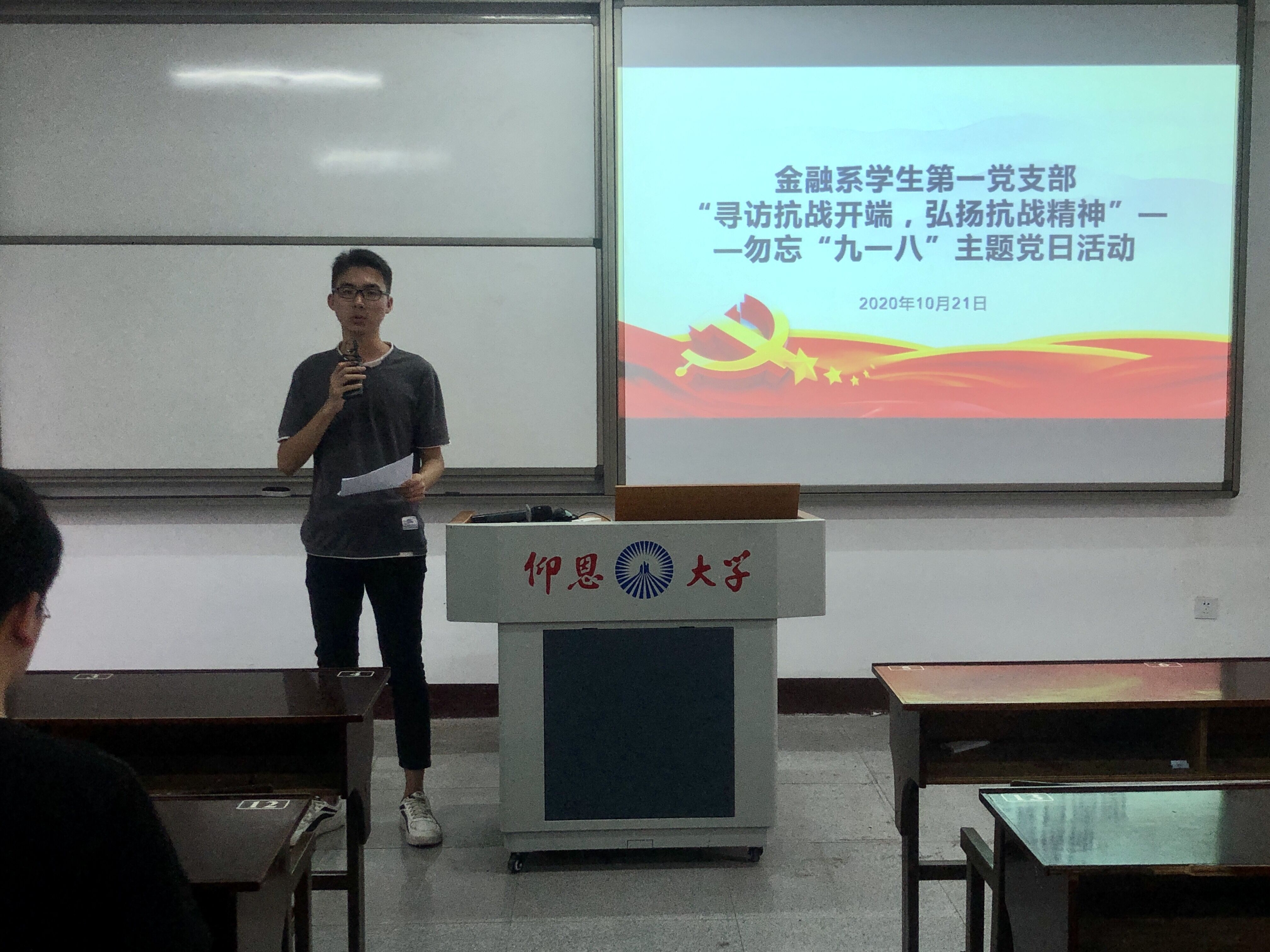 2020年10月21日,九游体育官网金融系学生第一党支部于仰恩楼D2-401开展“寻访抗战开端,弘扬抗战精神”——勿忘“九一八”主题党日活动。本次活动参会人员有支部组织委员何丽玲、支部全体党员和18级、19级各班积极分子代表。