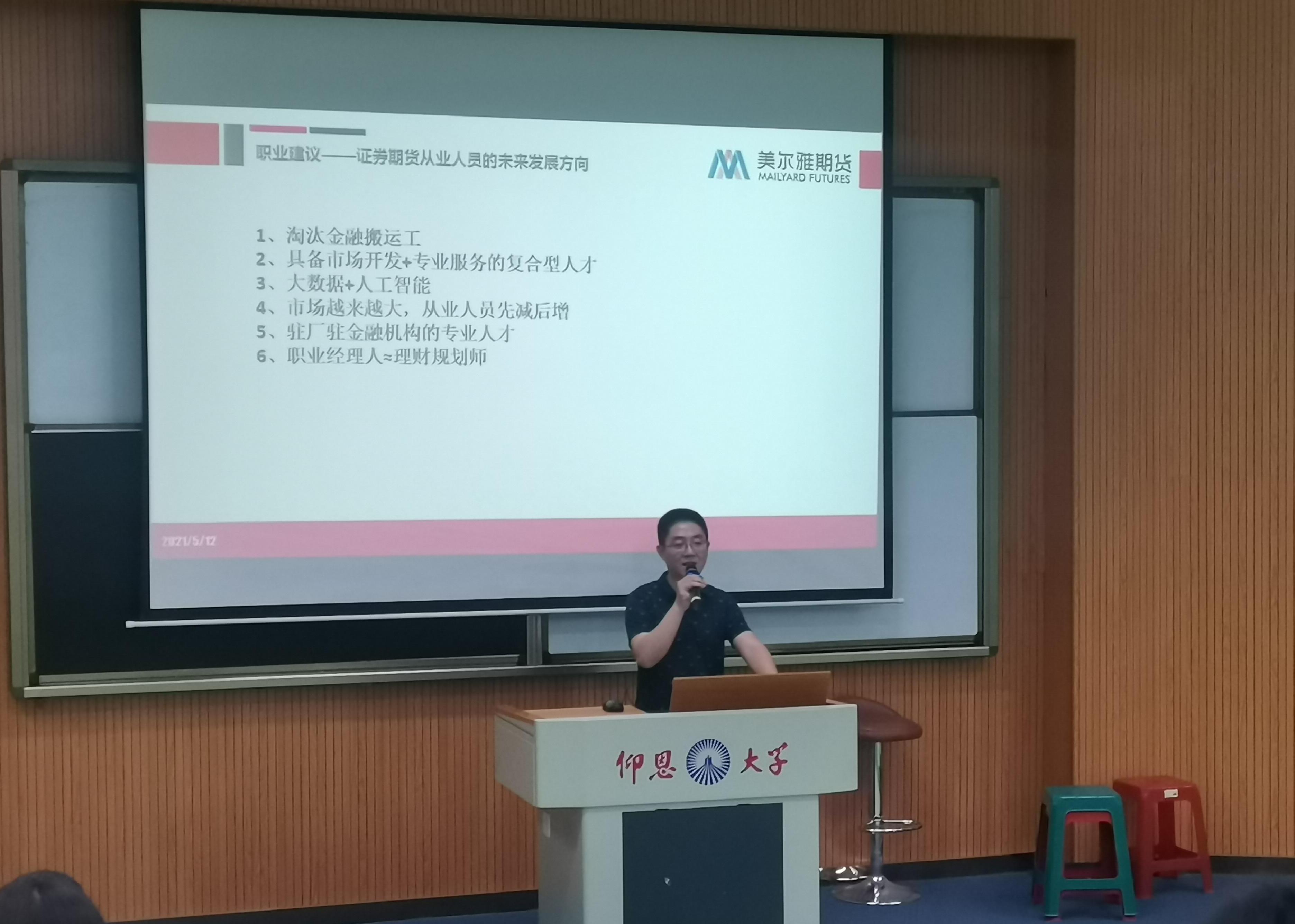 讲座中,吴发炜先生以“期货市场分析及行业就业前景解读”为主题,从三个方面为九游体育学生深入浅出的分析了期货行业具有发展前景的原因:首先是期货行业人才缺口大,近年来人才需求量持续增长;其次是金融期货、投资业在全行业平均年薪排行榜中位居前列;最后是近期股指期货和融资券业务的相继启动,使得期货及衍生品专业人才越来越炙手可热。吴发炜先生用通俗易懂的语言与行业实例相结合,极大地激发了在场同学对期货行业的兴趣。