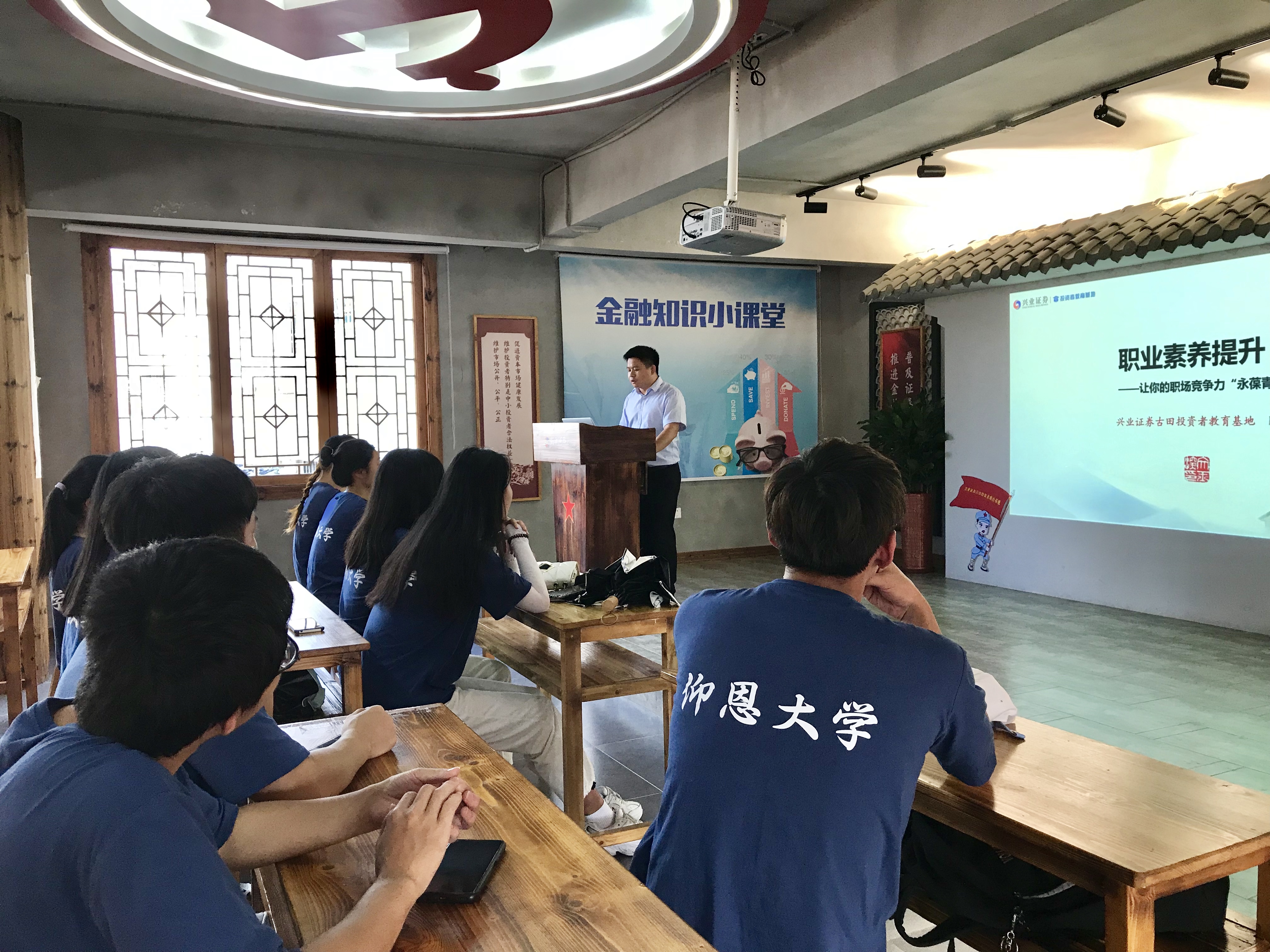 活动过程中,兴业证券投资者教育基地负责人从投资者认定、投资品种划分、投资理论等方面开展了投资者教育经验分享会,并播放了“习近平总书记来访古田”的视频,使实践队队员在学习投资理论知识的同时了解到兴业证券的红色企业文化。