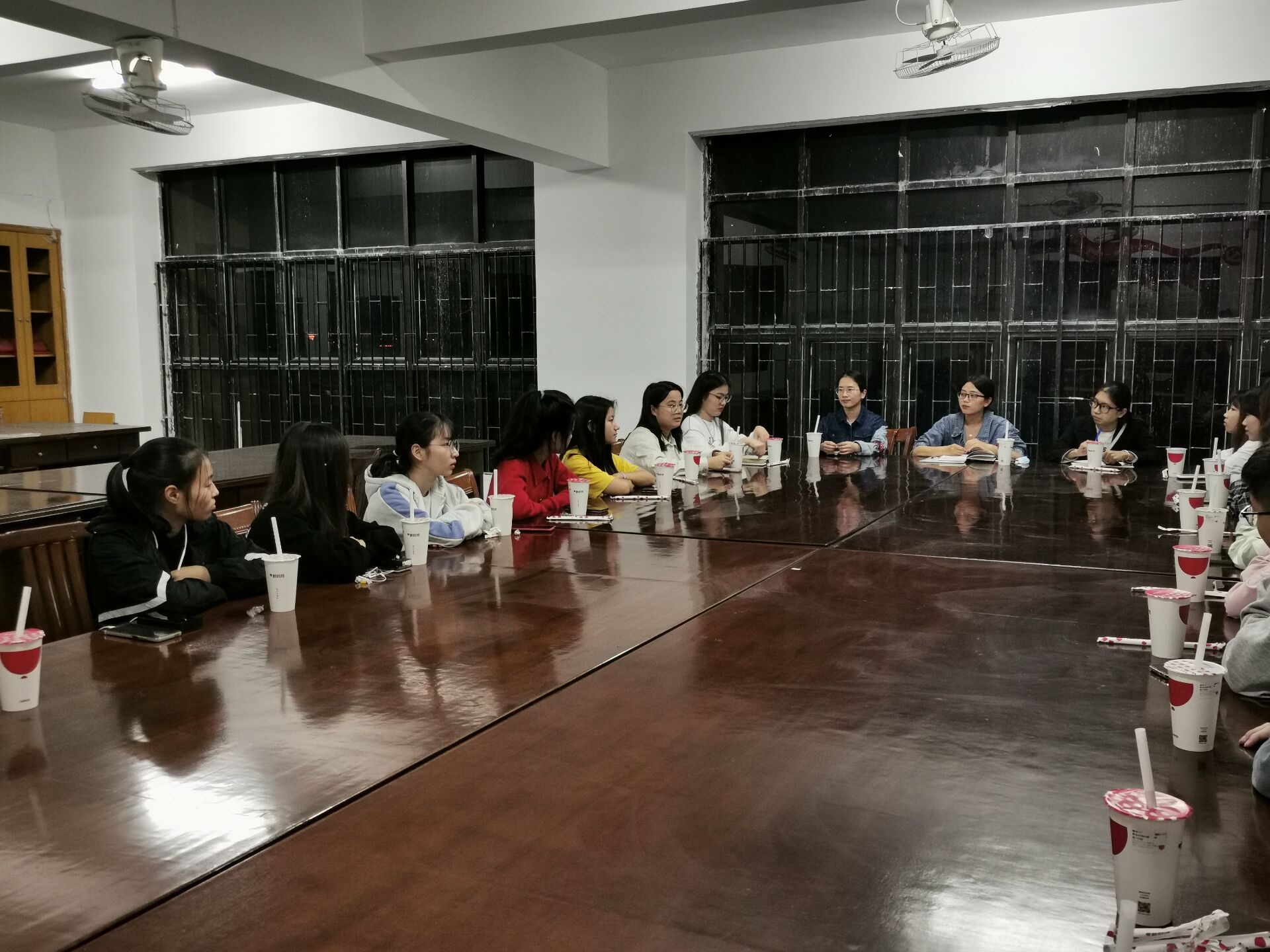 图1 党总支支委与干事讨论工作 本次会议包含“自我介绍环节”、“各党总支干事经验总结”及“老师总结和归纳”三项内容。在此次会议上,党总支支委、干事首先进行了自我介绍,互相认识、了解。其次,党总支副书记赖桂全对总支工作及干事分工进行了解,并进一步了解各干事对总支工作的建议及个人意向工作规划。最后,党总支副书赖桂全就党总支工作进行总结及工作安排,并就近期主要工作进行具体化任务安排。