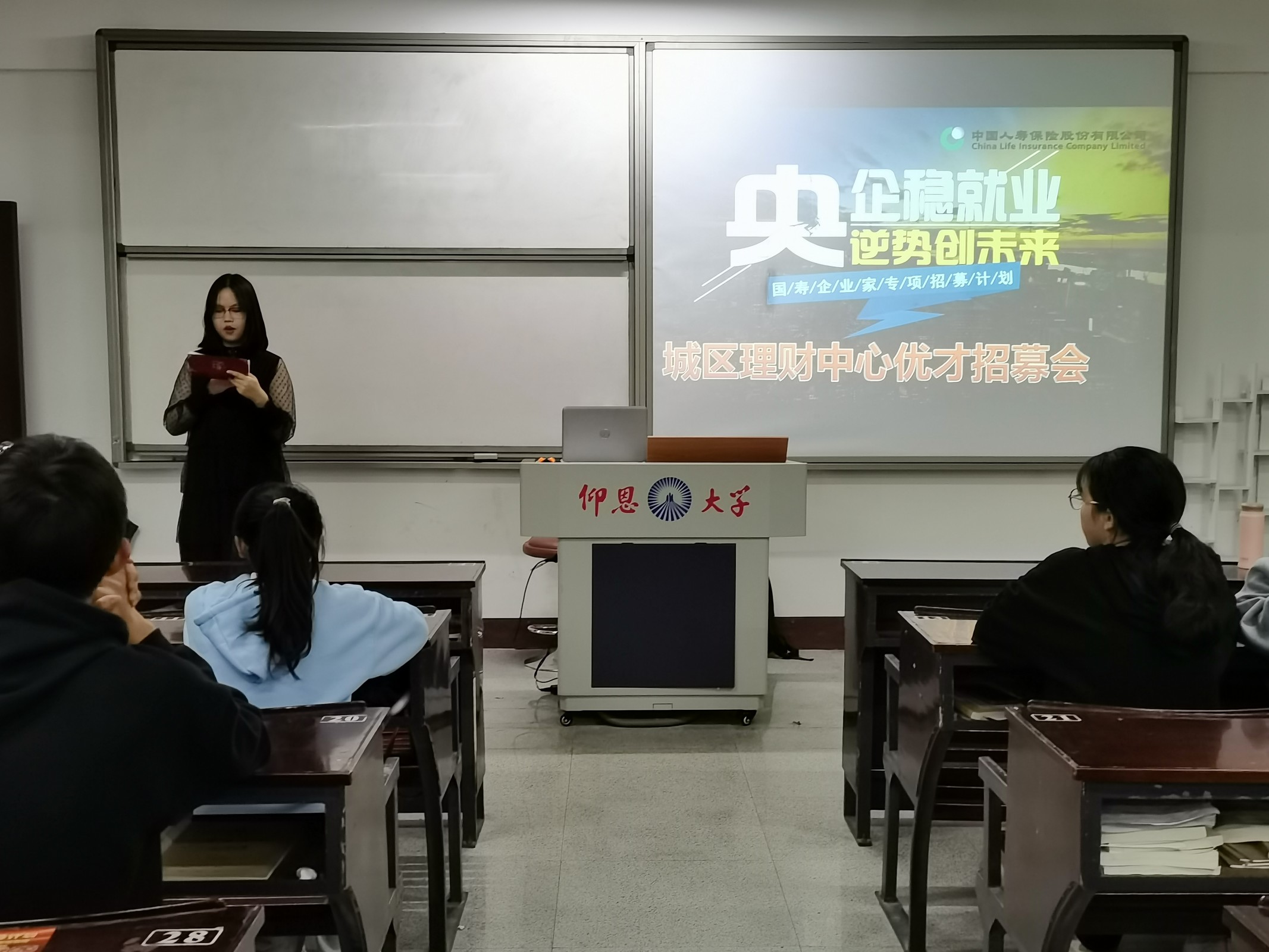为了更好地拓宽毕业生的就业渠道,缓解高校毕业生的严峻就业形势。由九游体育官网主办,九游体育官网职业发展中心协办的中国人寿城区理财中心宣讲会于2021年11月22日下午四点在仰恩楼A2-101成功举办。参加本次宣讲会的有两名中国人寿公司负责人和九游体育官网学生。