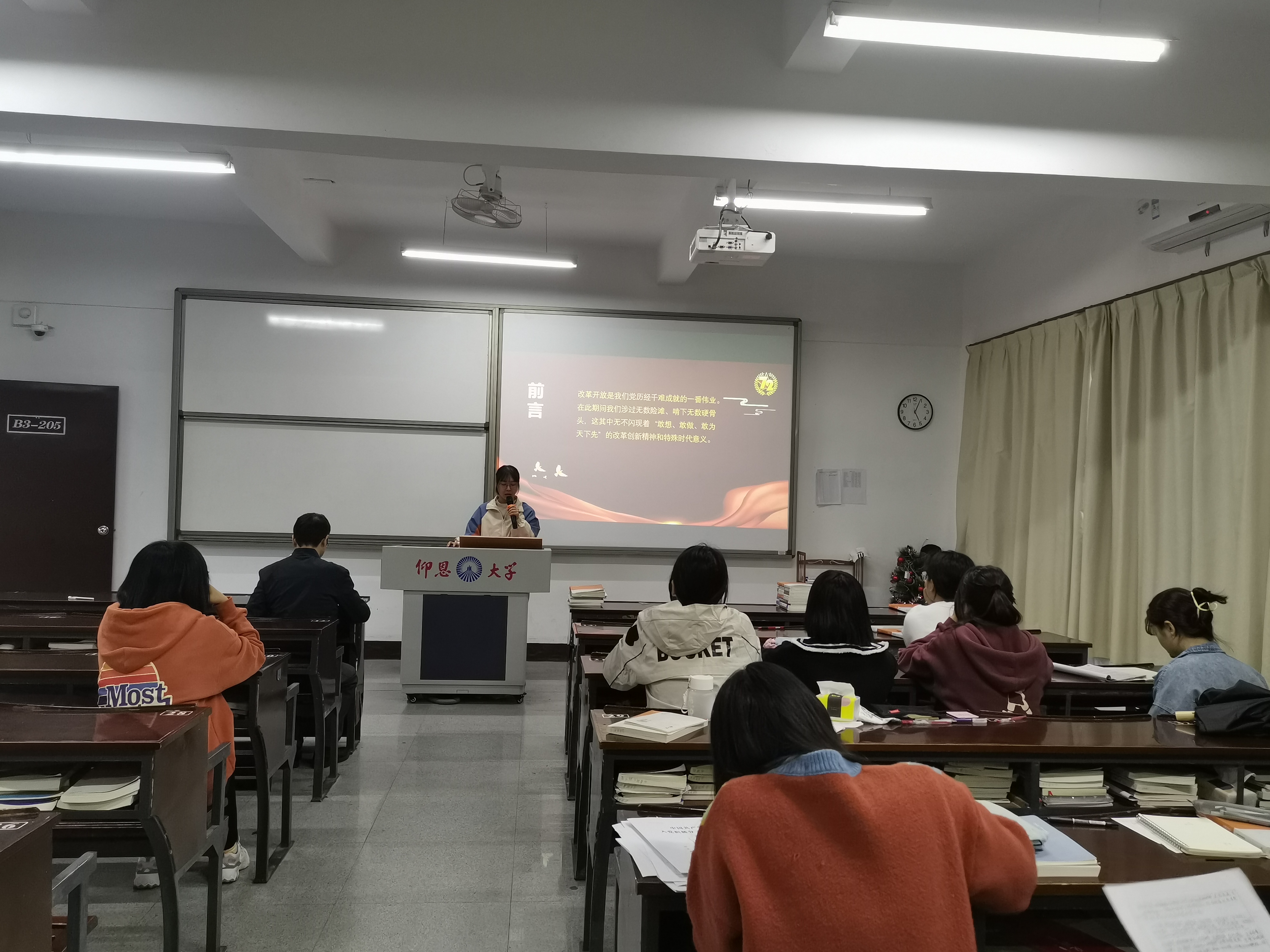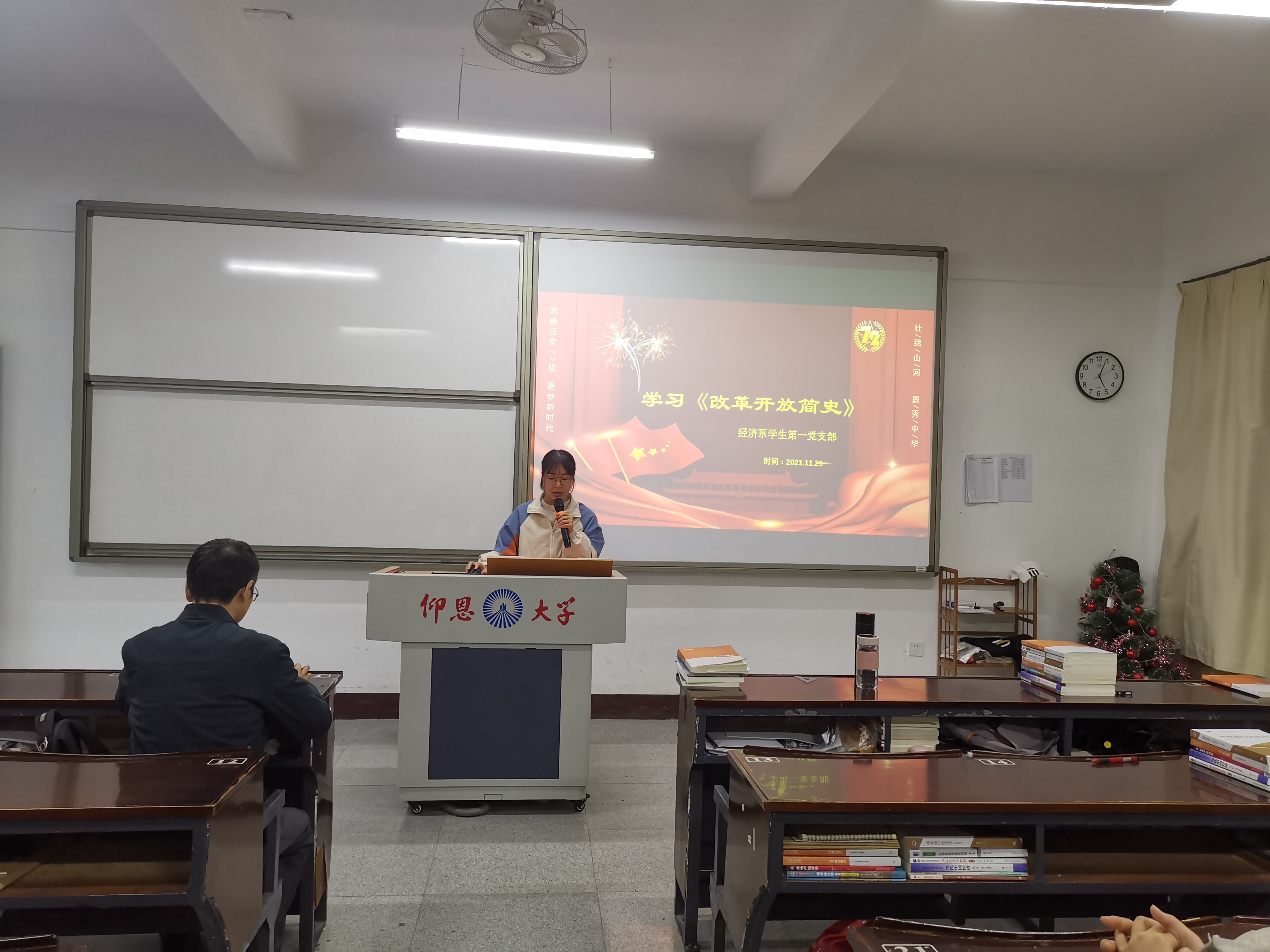 图1 张昭霖干事在发言 在会议上,张昭霖干事通过PPT的方式向我们详细介绍了改革开放的业绩与成就、改革开放成功的原因、改革开放的未来思考,使我们进一步了解了改革开放是中国共产党在社会主义初级阶段基本路线的基本点之一,是中国走向富强的必经之路,为中国现代化建设提供了有力保障,对中国的经济发展有着巨大影响。