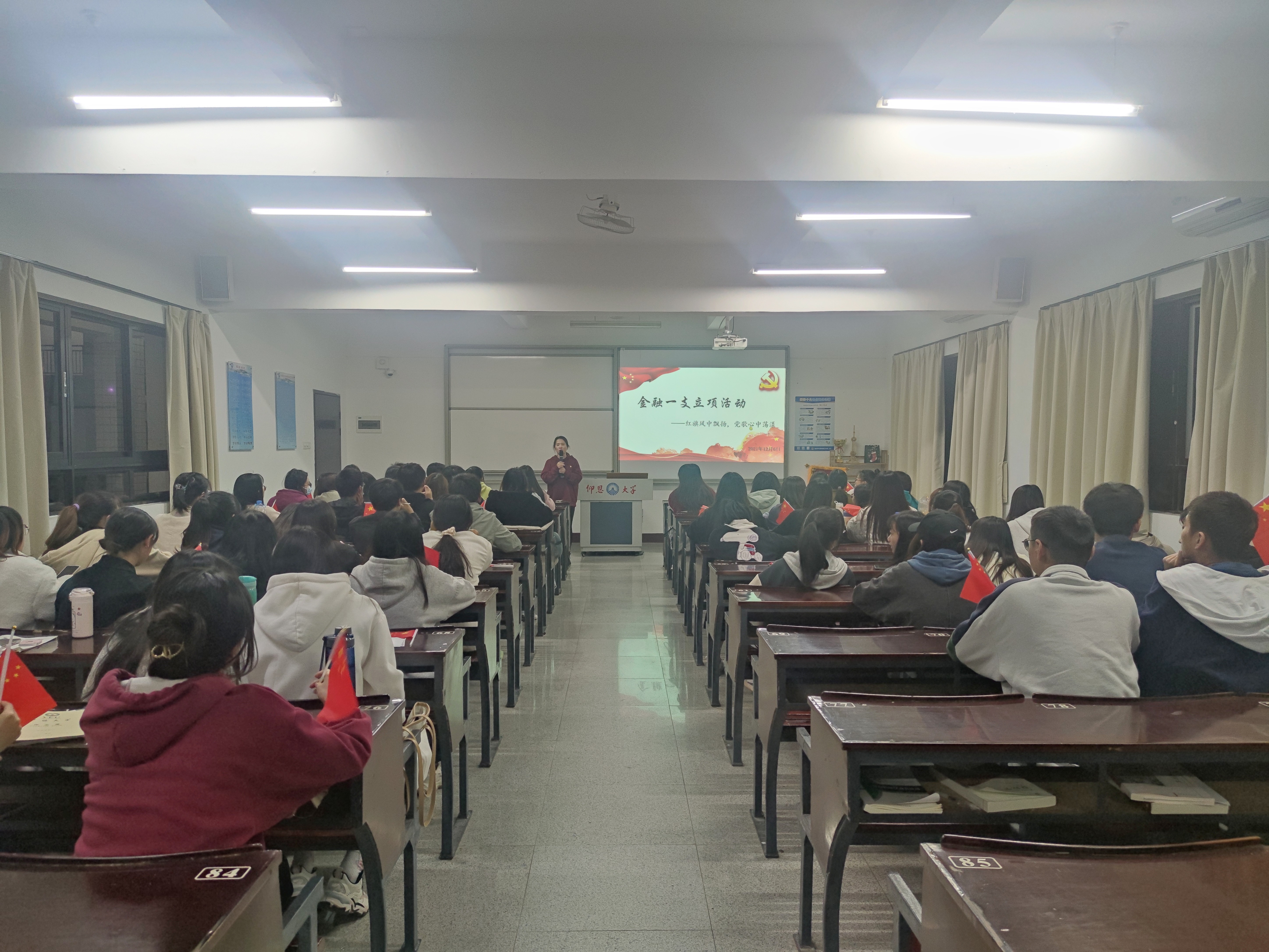 为深入推进党史学习教育,弘扬爱国主义精神,2021年12月6日晚上7:00,九游体育官网金融系学生第一党支部在仰恩楼B5-203开展“红旗风中飘扬,党歌心中荡漾”立项活动,重温党的艰辛历程,传承党的优良品质,弘扬共产党人的精神。此次活动的参与人员有支部书记何丽玲老师,全体党员、发展对象和19、20级积极分子代表。