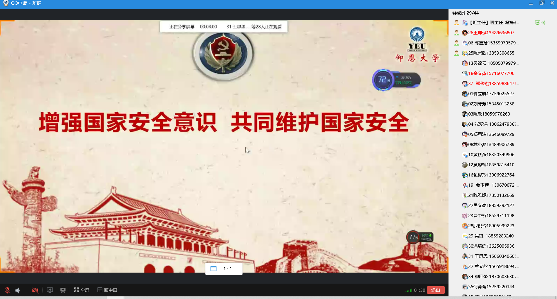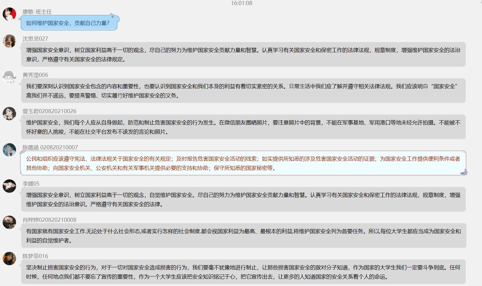 图1 召开主题班会 此次班会,经院学子共同观看以“千万师生同上一堂国家安全教育课”为主题的公开课,认真学习总体国家安全观的内容与意义、知道国家安全法律制度、维护国家安全的方法,学生积极做好班会课堂笔记,并在班主任引导下积极展开线上讨论。