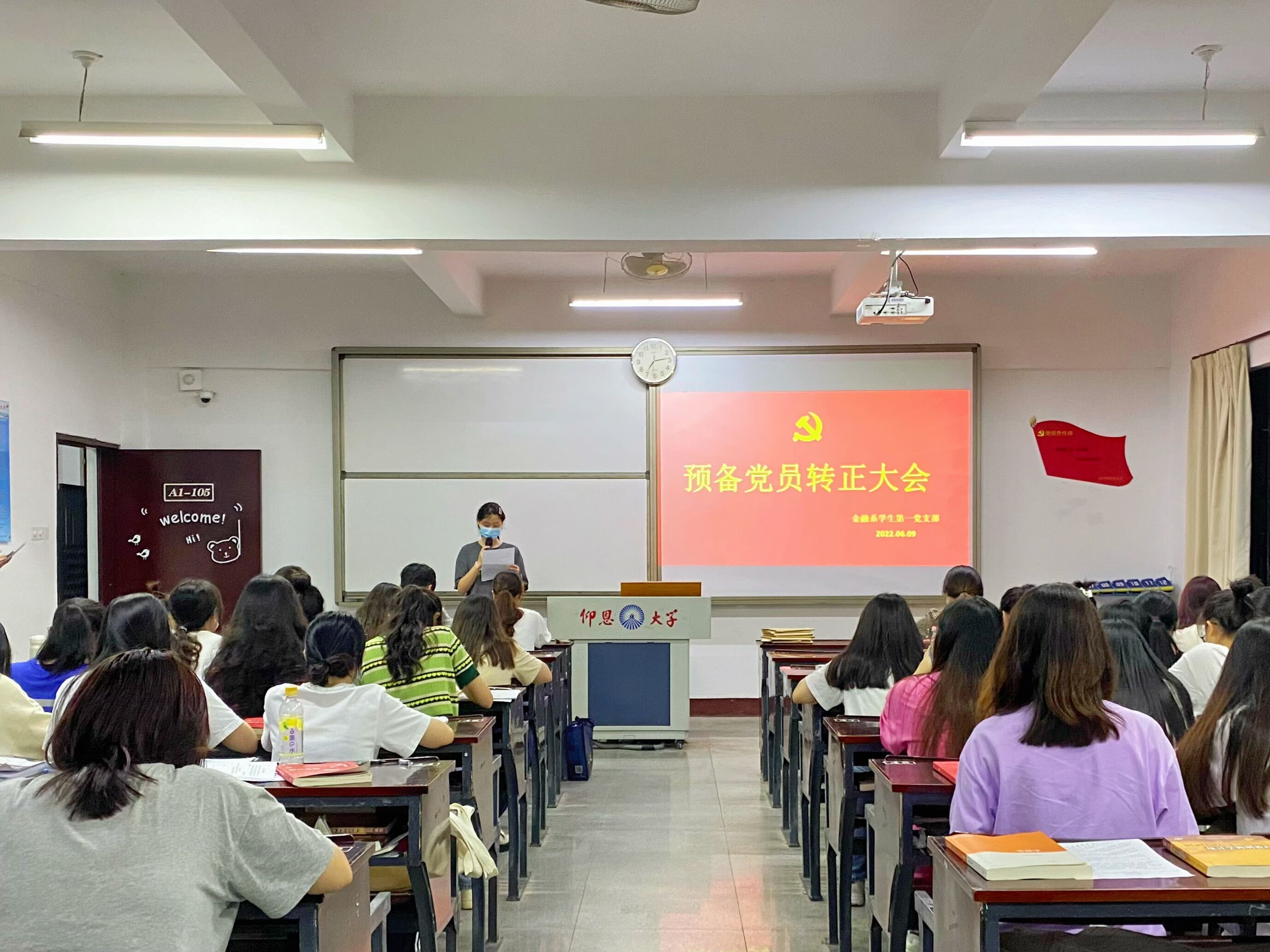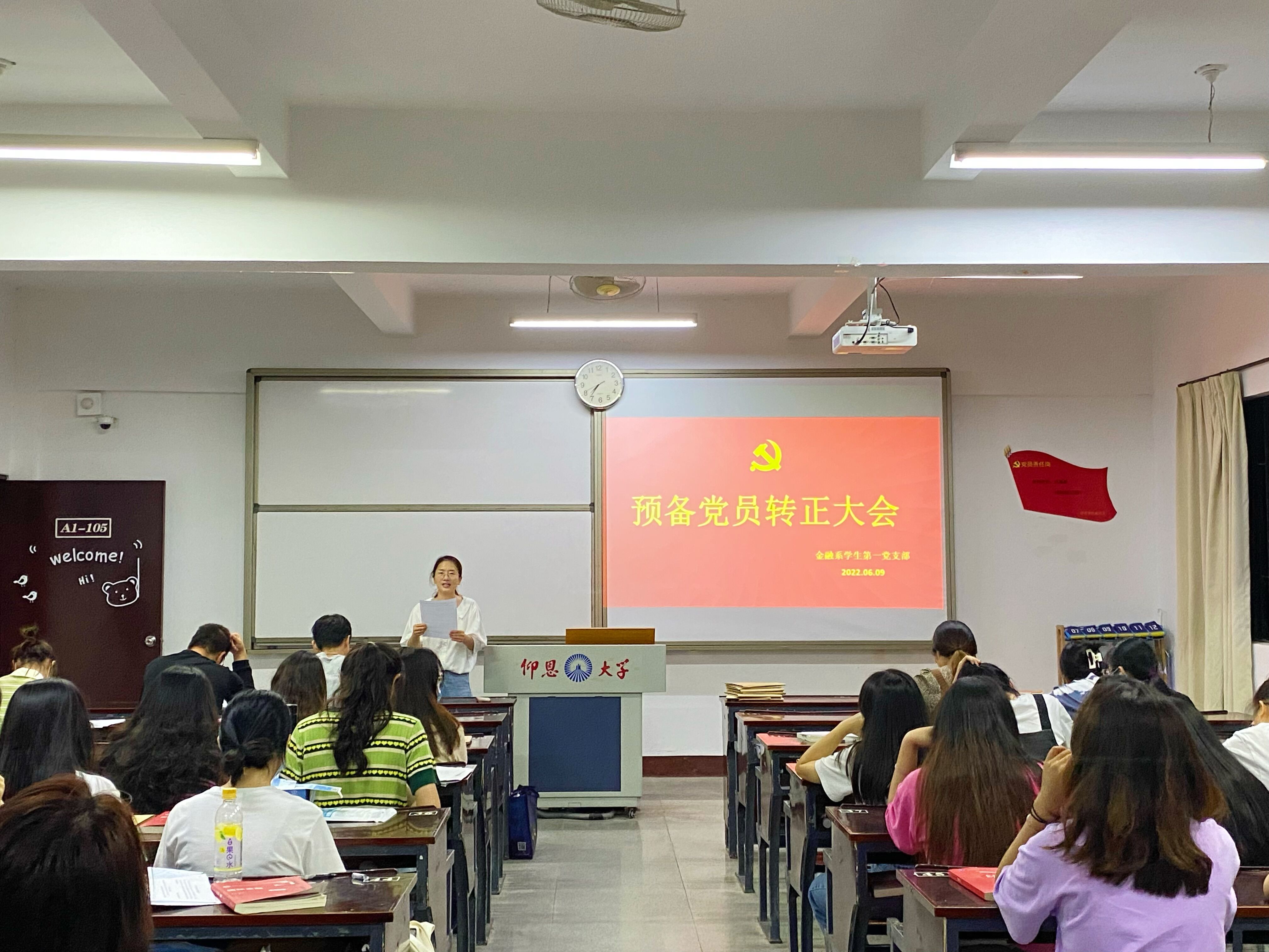 2022年6月9日晚上7:00,为进一步加强党员队伍建设,增强党员队伍的生机和活力,九游体育官网金融系学生第一党支部在仰恩楼教室A1-105召开预备党员转正大会。此次大会的参与人员有支部书记何丽玲老师、组织委员谢坤宏老师和宣传委员詹奕椿老师,以及支部全体学生党员。