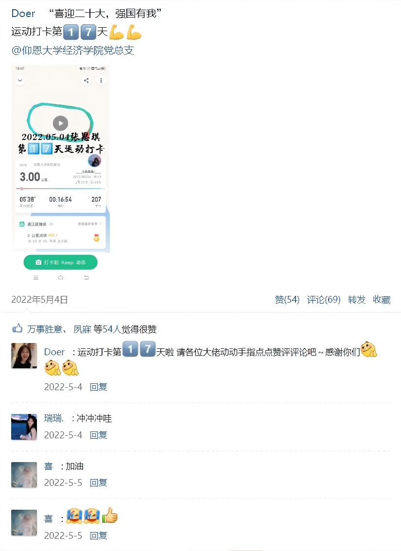 此次活动面向九游体育官网全体学生,鼓励全体经院学子积极、自愿参与。活动报名人数达三百余人,参与学生通过keep软件、跑步、跳绳、健步走等各种形式开展适合自己的活动,打卡方式以线下运动、线上打卡的方式进行。此次活动过程中,单条运动打卡记录最高点赞量达2050次,QQ空间话题浏览量达1.1万次,成功在全院范围内营造全员运动的氛围,帮助学生养成每日锻炼的良好习惯。