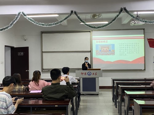 本次活动,主持人通过PPT讲解的方式,从党章的修正、关于十九届中央委员会报告的决议两个方面向大家普及了党的二十大是在全党全国各族人民迈上全面建设社会主义现代化国家新征程、向第二个百年奋斗目标进军的关键时刻召开的一次十分重要的大会。通过本次学习会的学习,支部全体成员充分感受到党章的修改体现了全党意志,符合时代发展要求,充分体现了党的工作和党的建设的新鲜经验,更是顺应了党心和民心。