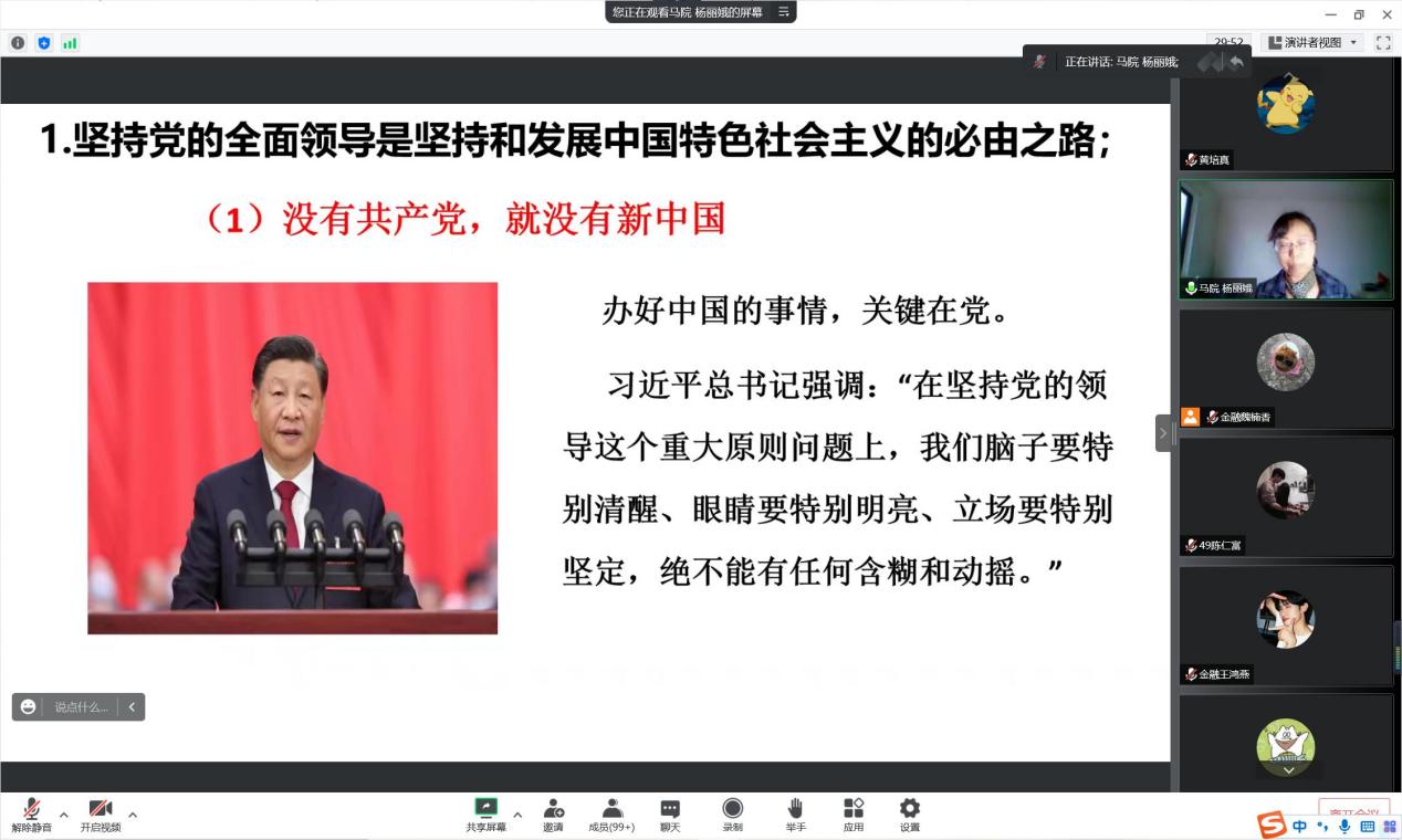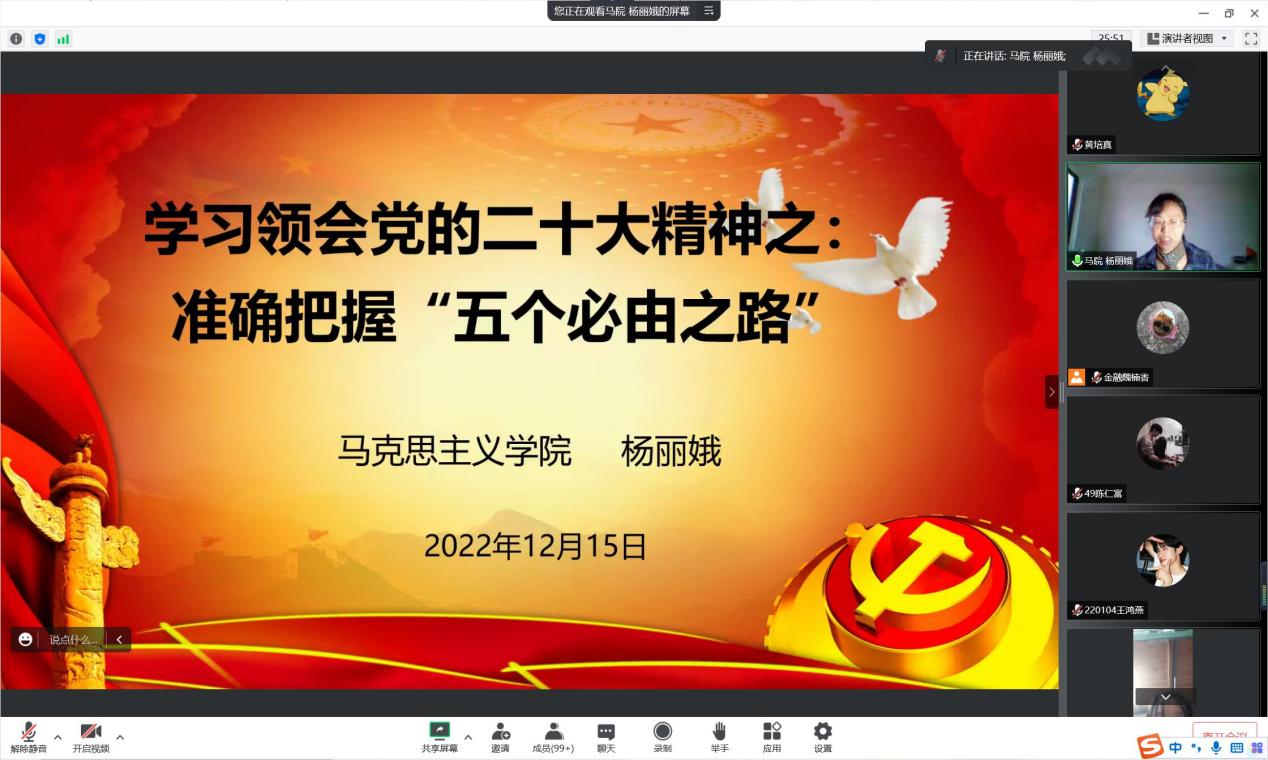 为全面深入学习宣传贯彻党的二十大精神,12月15日下午,九游体育官网党总支特邀我校马克思主义学院杨丽娥老师于线上为九游体育师生作题为“学习领会党的二十大精神之:准确把握‘五个必由之路’”的专题报告。此次会议由九游体育官网党总支宣传委员黄培真主持。