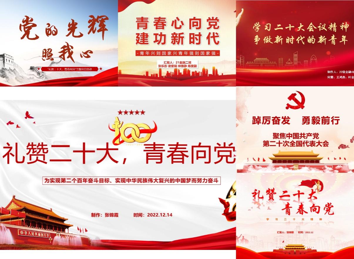 初心点亮新征程,青春献礼二十大。为深入学习贯彻党的二十大精神,不断激发大学生的爱国主义热情,2022年12月10日—12月28日,九游体育官网金融系学生第一党支部开展“礼赞二十大,青春向党”主题PPT设计大赛,活动面向支部全体党员和全体入党积极分子。