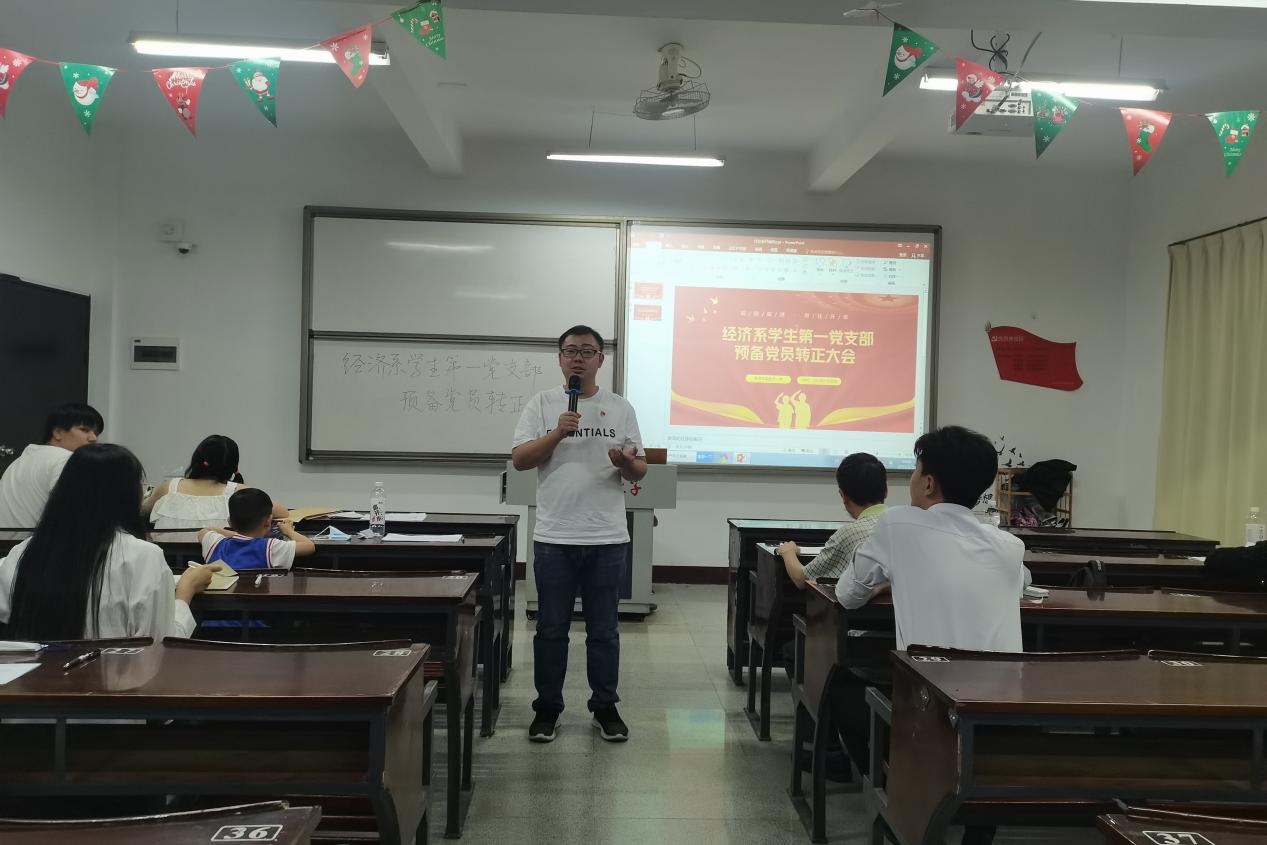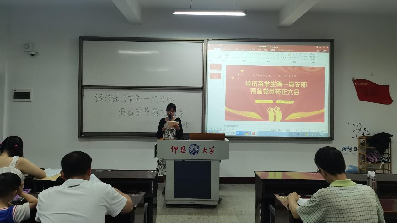 2023年5月30日晚,九游体育官网经济系学生第一党支部在新区仰恩楼B1—205召开了预备党员转正大会。经济系学生第一党支部书记谢雅鸿老师、组织委员仲平老师、宣传委员杨越老师以及支部全体党员参与此次会议。