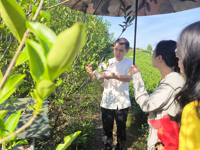 图2 实践队员同传承人刘大师参观有机茶园