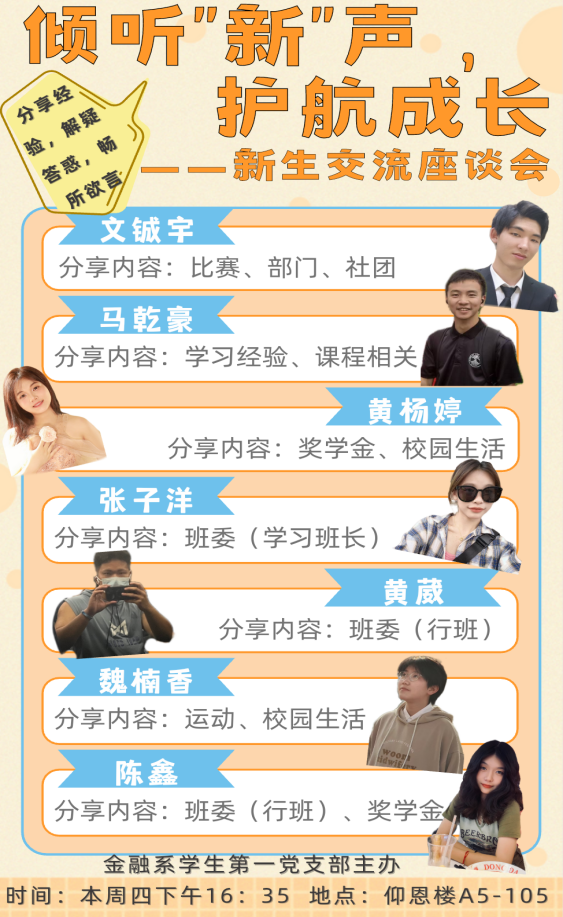 为了尽快让23级新生适应大学生活,传授各方面相关经验,明确未来奋斗目标。2023年10月12日下午16:40,金融系学生第一党支部在仰恩楼A5-105组织开展“倾听‘新’声,护航成长”新生交流座谈会,本次交流座谈会邀请到了五位21级和两位22级优秀的学长学姐进行分享。本次参会人员有支部书记何丽玲老师,金融系23级所有新生班委及其他同学。