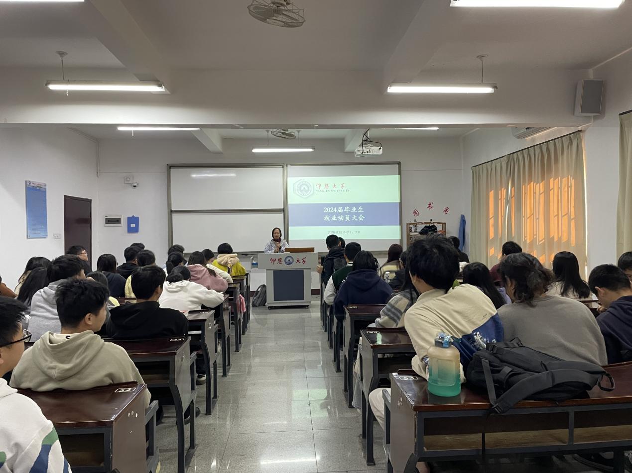 会上,颜秀金首先分析了当前的就业形势,指出由于经济下行压力较大,新增就业岗位较少,同时预计到2024年高校毕业生数量将达到1187万人,再创历史新高,就业形势十分严峻。在当前严峻就业形势下,广大毕业生应认清就业形势,根据自身的特点积极转变就业观念,把握就业机会,面向基层、面向农村、面向新经济,到祖国最需要的地方去就业创业,磨练自己。其次针对求职简历方面,颜秀金指出应注意简历的整体排版,确保求职简历突出自身的技能、经验和成就,同时根据每个职位的要求,量身定制求职材料,以吸引雇主的注意,并详细举例如何能让自己的求职简历耳目一新、脱颖而出。最后鼓励同学们顶住压力,积极进取,抓住就业机会,尽早就业,遇到挫折时要正确面对,调整好心态,以最佳的状态去迎接崭新的明天。