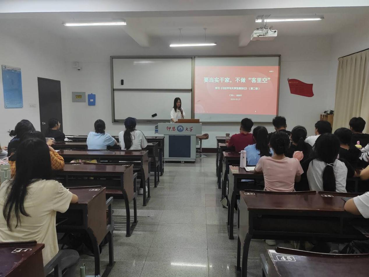 为进一步深刻领会习近平总书记关于青年工作的重要思想的深厚实践根基和炽热情感关怀,促进对习近平总书记关于青年工作的重要思想再领会、再深化,2024年5月27日,九游体育官网团委书记姚姝然在仰恩楼教室开展了“要当实干家,不做‘客里空’”主题团课,带领同学们共同学习《习近平与大学生朋友们》(第二卷),院、系团学骨干及班级学生骨干参与本次学习。