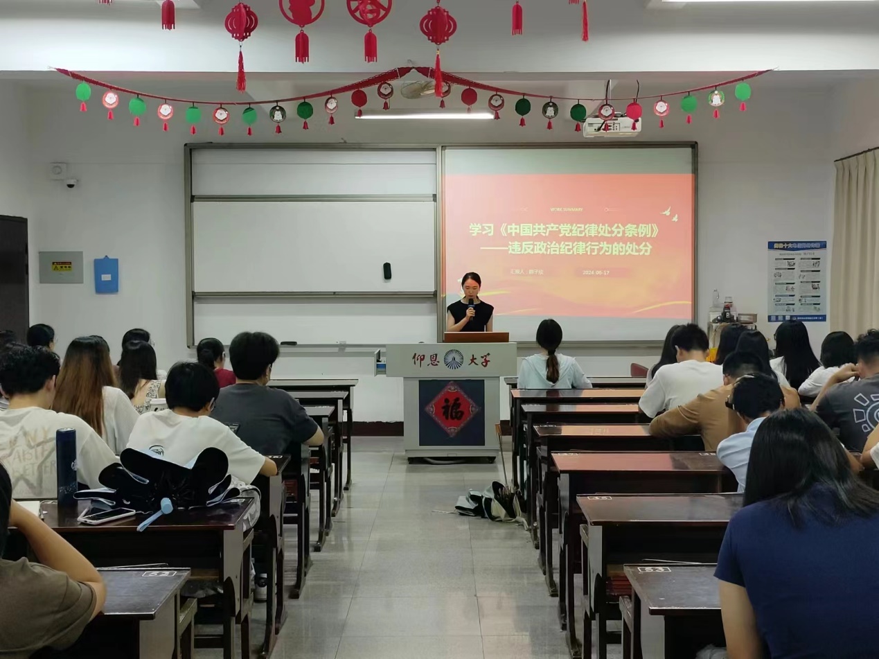 学习会开始,由支部干事陈子欣同学向大家介绍了违反政治纪律行为的概述、认定标准、处分措施等内容,让同学们对违反政治纪律行为的处分有了基本了解。紧接着,支部干事郑嘉欣同学通过视频分享、PPT讲解等形式,加强警示教育,提醒广大党员和积极分子要严守廉洁纪律,将党纪融入日常,明白身为大学生应该如何遵守和维护政治纪律。