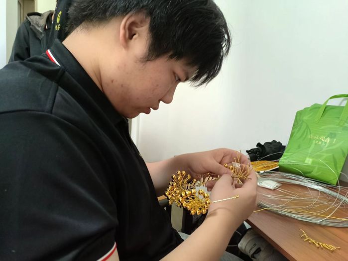 22日,实践队成员亲身参与闽剧头饰制作。在专业人员指导下,用心感受每个步骤,从选材到装饰,专注投入,深刻领略闽剧艺术的细微魅力。