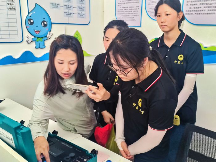 图2河长办工作人员讲解水质检测机器原理