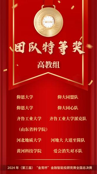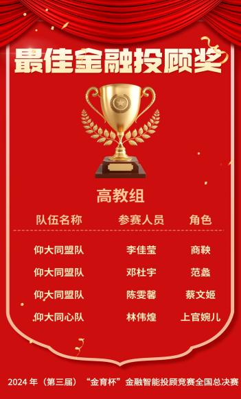 11月23日,我校两只参赛队伍在2024年“金育杯”金融智能投顾竞赛全国决赛中脱颖而出,两支参赛团队包揽全国总决赛高教组第一、第二名,获得团队特等奖的好成绩!参赛选手林伟煌、李佳莹、邓杜宇、陈雯馨获得个人最佳投资顾问奖,王晓茜、杨阳、林佳银、郑铠楠获得个人十佳投资顾问奖,林双妹老师获得竞赛最佳指导老师奖。