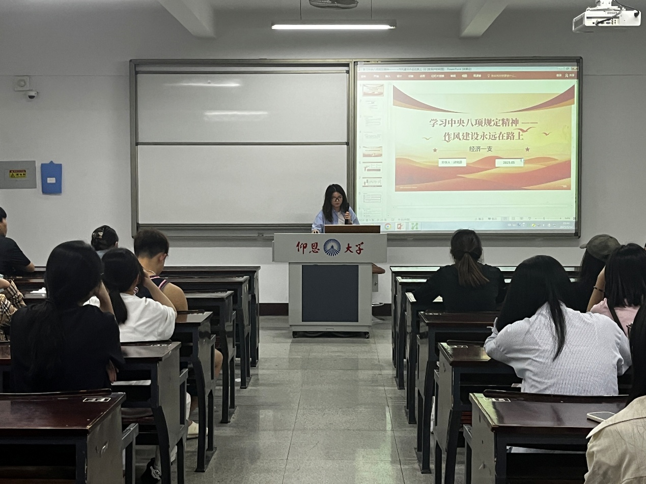为扎实推进深入贯彻中央八项规定精神学习教育,持续深化作风建设,推进全面从严管党治学,2025年5月14日,经济系学生第一党支部在新区仰恩楼C1-303组织开展“学习中央八项规定精神—作风建设永远在路上”为主题的党课学习。经济系学生第一党支部全体党员及积极分子参与此次党课。