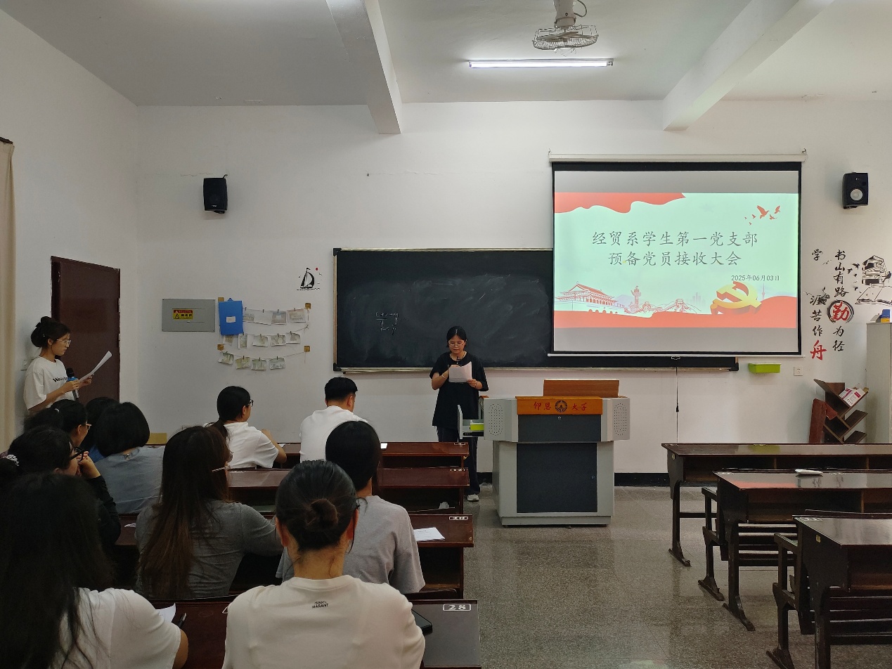 6月3日下午,经贸系学生第一党支部于普照楼101A组织召开预备党员接收大会。支部全体党员参加此次会议。本次会议由支部书记黄培真同志主持召开。