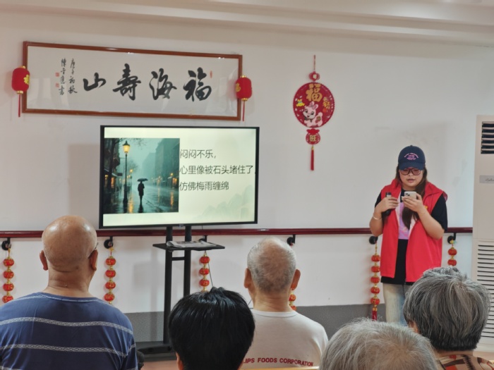 活动第二个环节由心帆金舟第二小队队长陈雨轩担任讲座主讲,她以通俗易懂的“情绪晴雨表”为切入点,针对老年人常见的“孤独感、价值感缺失、疾病焦虑”三大心理困扰,结合生活化案例提出科学调适建议;现场更通过“手指健康操”“呼吸冥想训练”等互动环节,带领老人体验即时解压技巧。最后,进行心理健康活动的讨论。