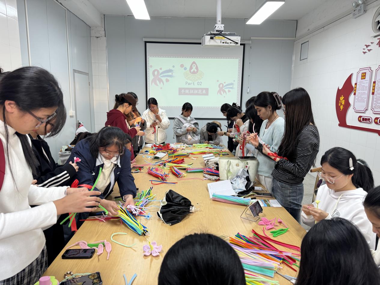 活动现场,学生干部卢韵如同学和学生干部郑淑妍同学通过科普讲解、案例分享传递防艾知识,帮助同学们科学认识疾病、破除认知误区、树立科学理性的防护观念;讲解结束后,同学们一同动手制作扭扭棒花束,并结合所学构思防艾宣语,将“科学防艾、温暖关爱”的理念融入创作,现场氛围温馨活跃。