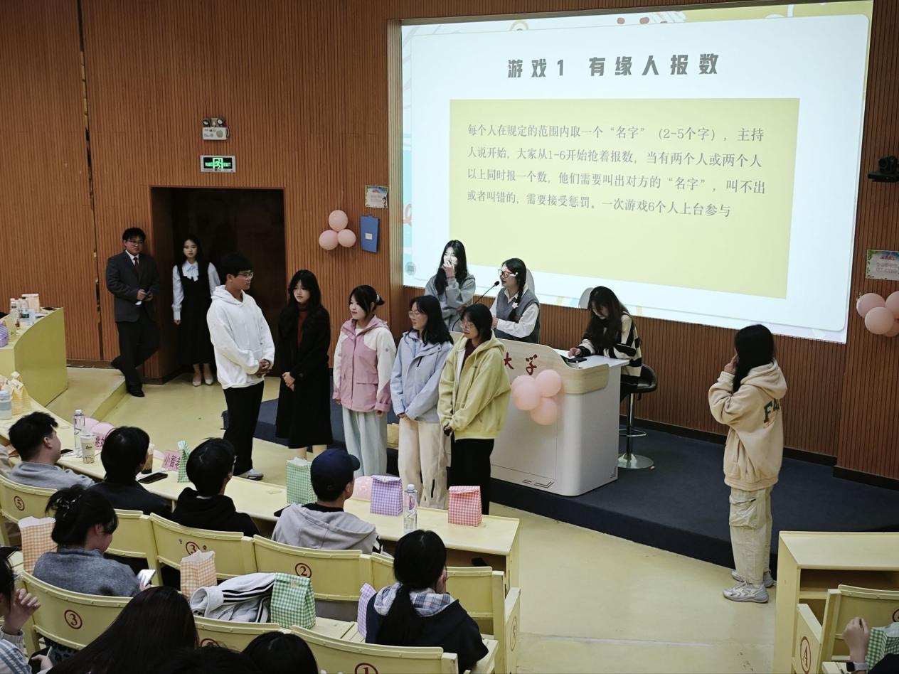 晚会现场节目类型丰富,视听节奏张弛有度:器乐独奏以婉转旋律铺垫氛围,歌曲演唱或清甜或深情,舞蹈表演用动感节奏引爆现场,各类节目轮番登场,将青春的多样色彩铺展在舞台之上。三轮抽奖环节穿插其中,每一次开奖都掀起全场欢呼;“有缘人报数”“你画我猜”等游戏项目里,同学们或组队协作、或默契比拼,陌生感在欢笑中消解,讲堂内始终洋溢着热烈鲜活的氛围。