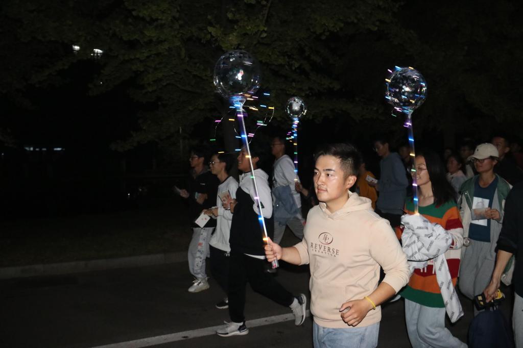 经过工作部门对前期线上宣传和线下安全保障的充分准备,夜跑活动于晚上七点在泰山广场准时开始。参与者在签到后领取了荧光手环,各色的手环在泰山广场中央齐聚,散发出荧荧的光亮。