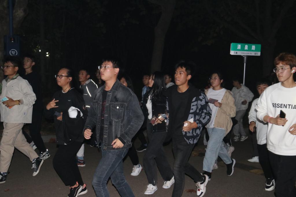 领跑人整理队伍,夜跑正式开始。本次活动从泰山广场出发,向东经过S1实验楼,整体呈环形路线,最终返回泰山广场,全长共计3公里。为了确保同学们夜跑途中的安全,领跑人用鲜明的标志物引领同学前进。在夜跑途中设有两个打卡点,同学们可以在打卡处盖章纪念并稍作休息调整。八点十分,跑步队伍回到泰山广场,夜跑活动也接近尾声。同学们在签到处有序领取交换物品并合影留念、有序签退,本次活动圆满结束。