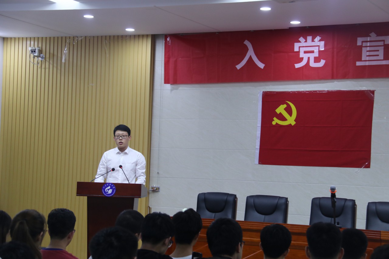 鲜红的党旗,醒目的主题横幅和庄严的宣誓词三者有力地渲染出庄重的气氛现场。大会第一项,全体起立,奏《国际歌》。第二项,党员宣誓仪式。在杨洪骞同志的带领下,全体预备党员右手握拳举过肩头,面向鲜红的党旗庄严宣誓,在激昂的宣誓声中,大家接受了一次身心的洗礼。大会进行到第三项、第四项和第五项,毕业生党员代表郭娜、新党员代表胡向前以及入党积极分子代表殷昌承依次上台发言。几位同志不约而同地表示将会以一名共产党员的标准严格要求自己,不断完善自己,在党组织的领导下继续努力,恪守在党旗下的诺言、自觉加强党性修养。